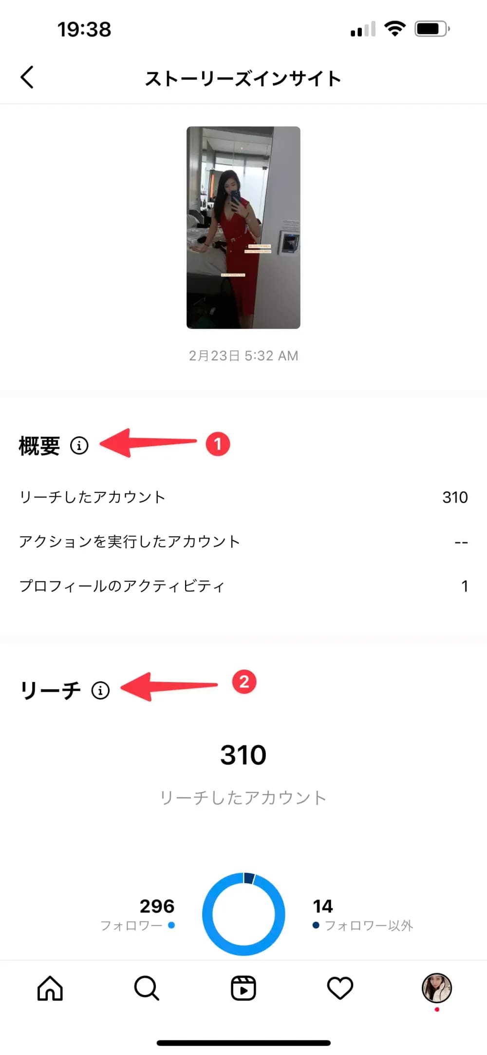 注:ストーリーズのインプレッションは、Instagramストーリーズがユーザーに閲覧された回数を計算し、リーチはInstagramストーリーズを閲覧したユニークアカウントの数を示します。