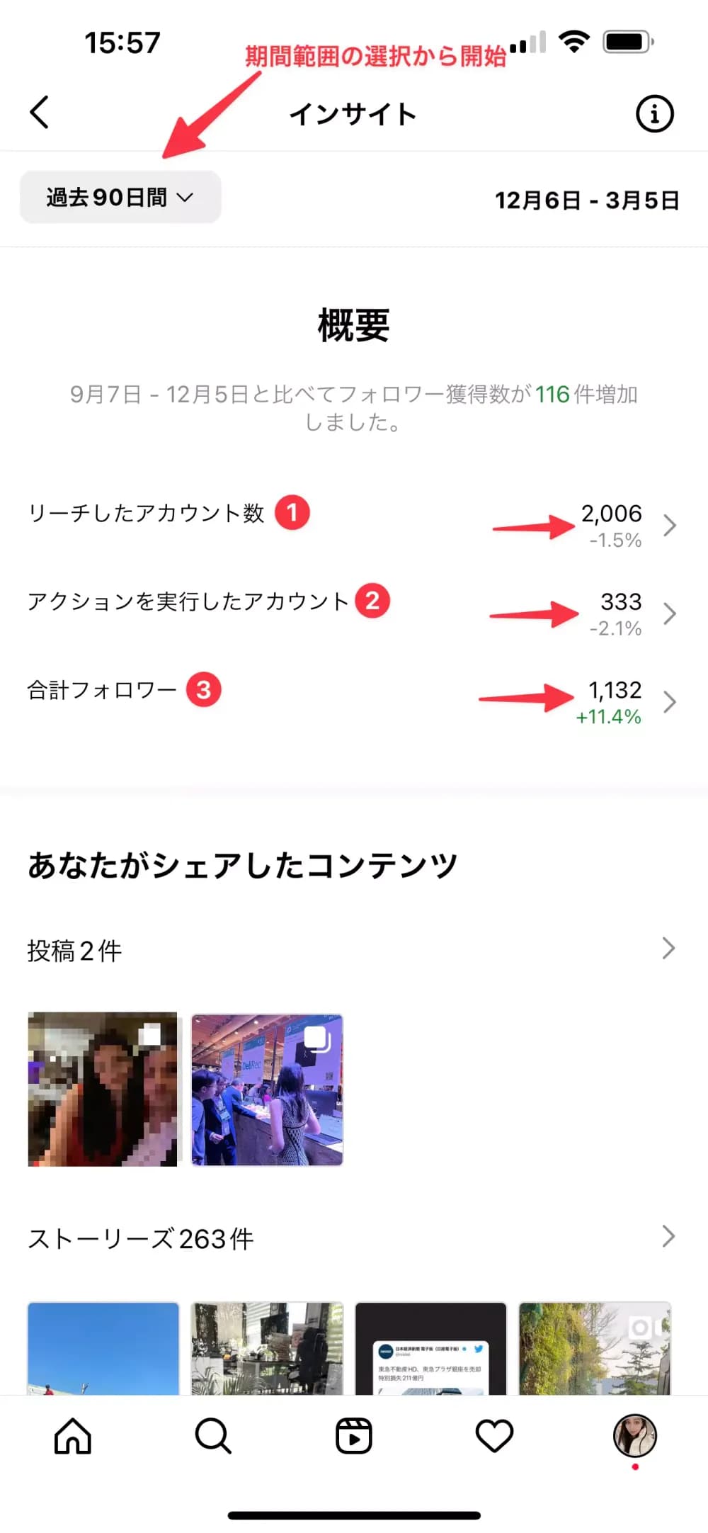 概要 ①リーチしたアカウント数 ②エンゲージメント ③合計フォロワー