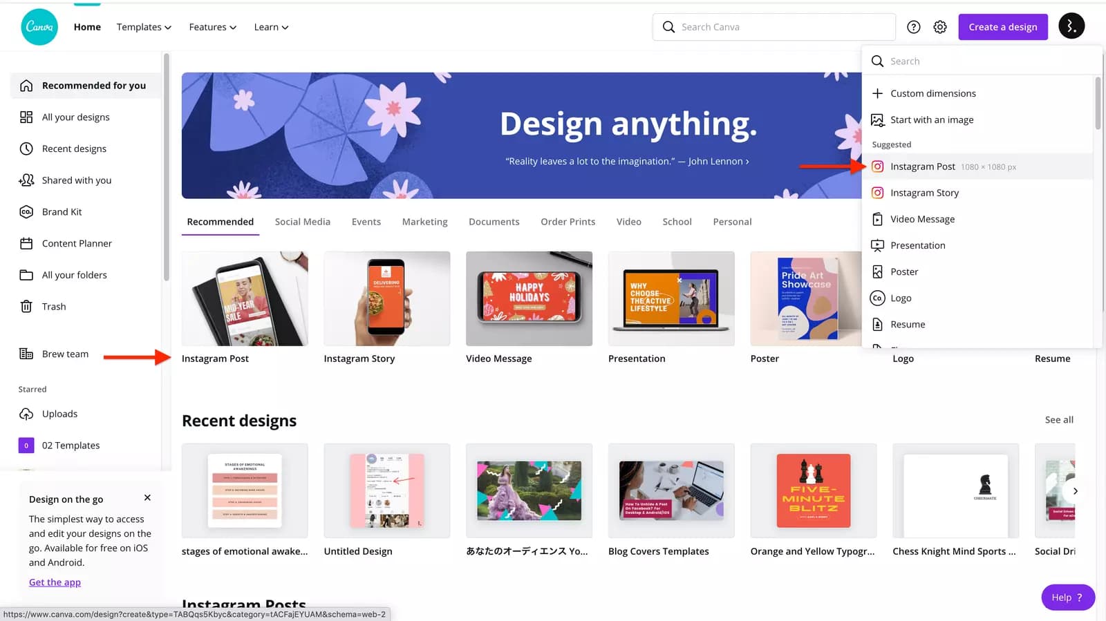 Canvaを立ち上げると、まずは「何を作りたいか」フォーマットを選びます。ソーシャルメディア用の投稿として、Instagramフィード投稿を選びましょう。