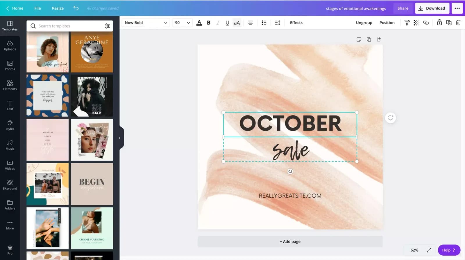 Canvaはこのテンプレートから、全ての文字やロゴに至るまで全てをカスタマイズできますし、この文字のテンプレートはいらないな、と思う場合は削除もできます。