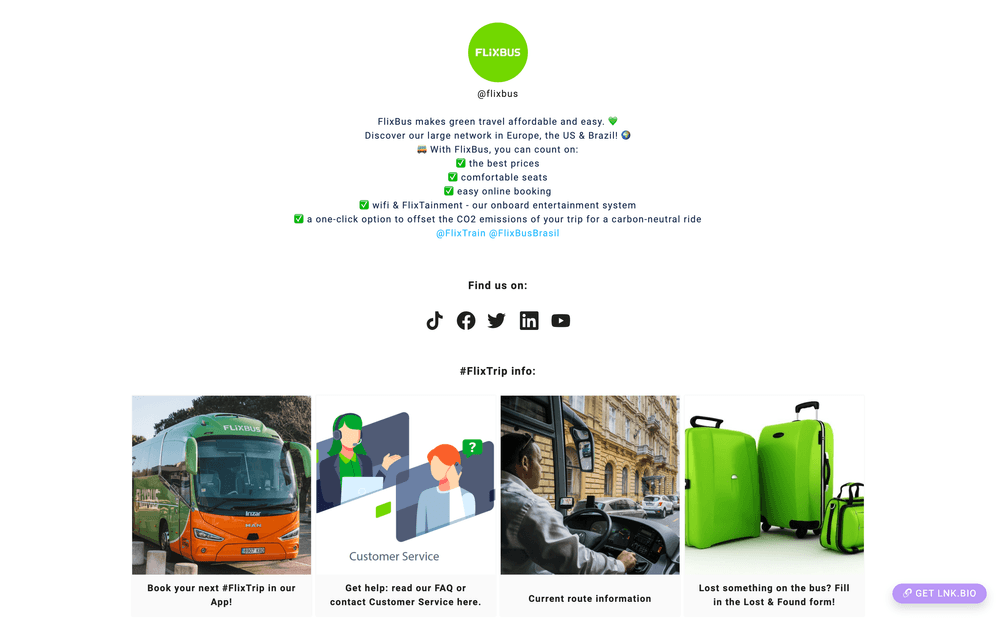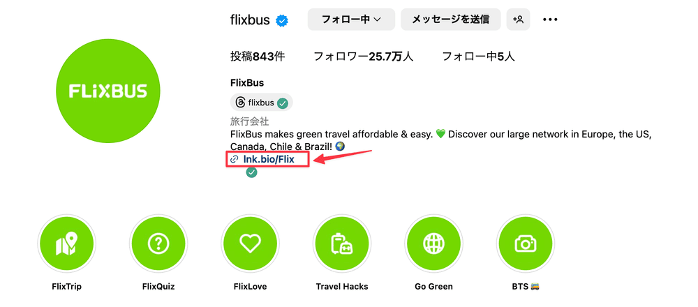 世界最大の高速長距離バス会社FlixbusのInstagramにもあるリンクインバイオ