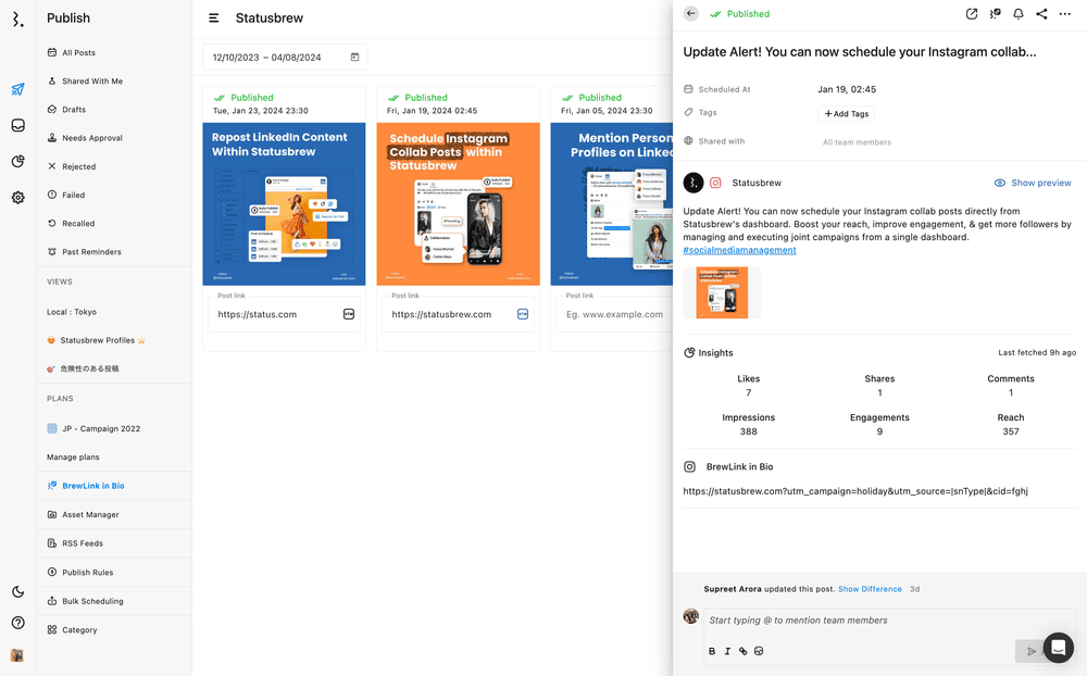Instagramの投稿に各種様々なリンクを追加する機能は、StatusbrewのInstagram投稿ワークフローに組み込まれており、複数のツール間での時間の浪費を省きます。