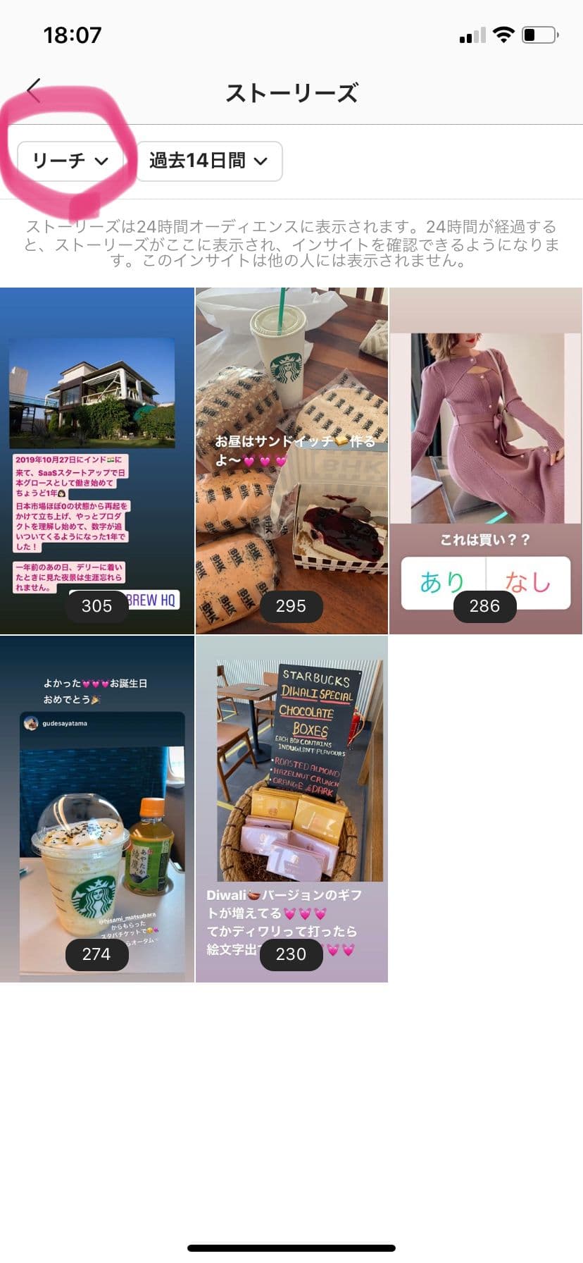 Instagramインサイトを開くとすぐに、24時間限定公開の各ストーリーを見たユーザーの数(リーチ)が表示されます。さらにストーリーごとの指標もフィードと同じように追跡できます。