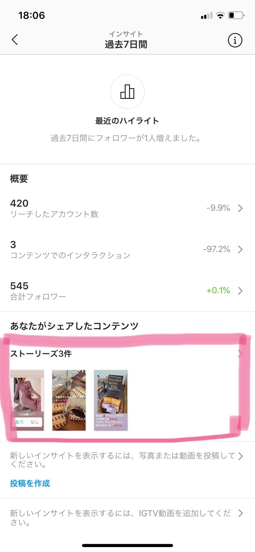これは、Instagramプロファイルへの訪問数です。これはInstagramインサイトの一週間のうちのリーチした人数と、投稿インサイトの中にもあります。 訪問数の違いを毎週比較するため、KPIシートやレポートを作成しているようであれば訪問数も追跡しましょう。 このように、一週間の合計のプロファイルへのアクセスを確認すると同時に、どの投稿からのアクセスが多かったかも考察しましょう。