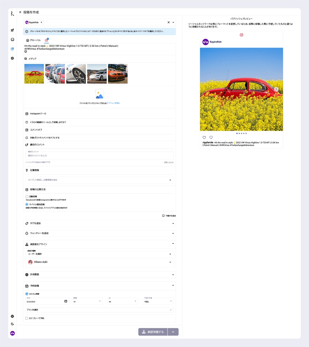 2023年5月よりInstagramストーリーズも自動予約ができるようになりました。ストーリーズ専用のコンポーズに画像や動画をアップロードし、あとは承認ワークフローの有無や予約時間を選ぶだけです。