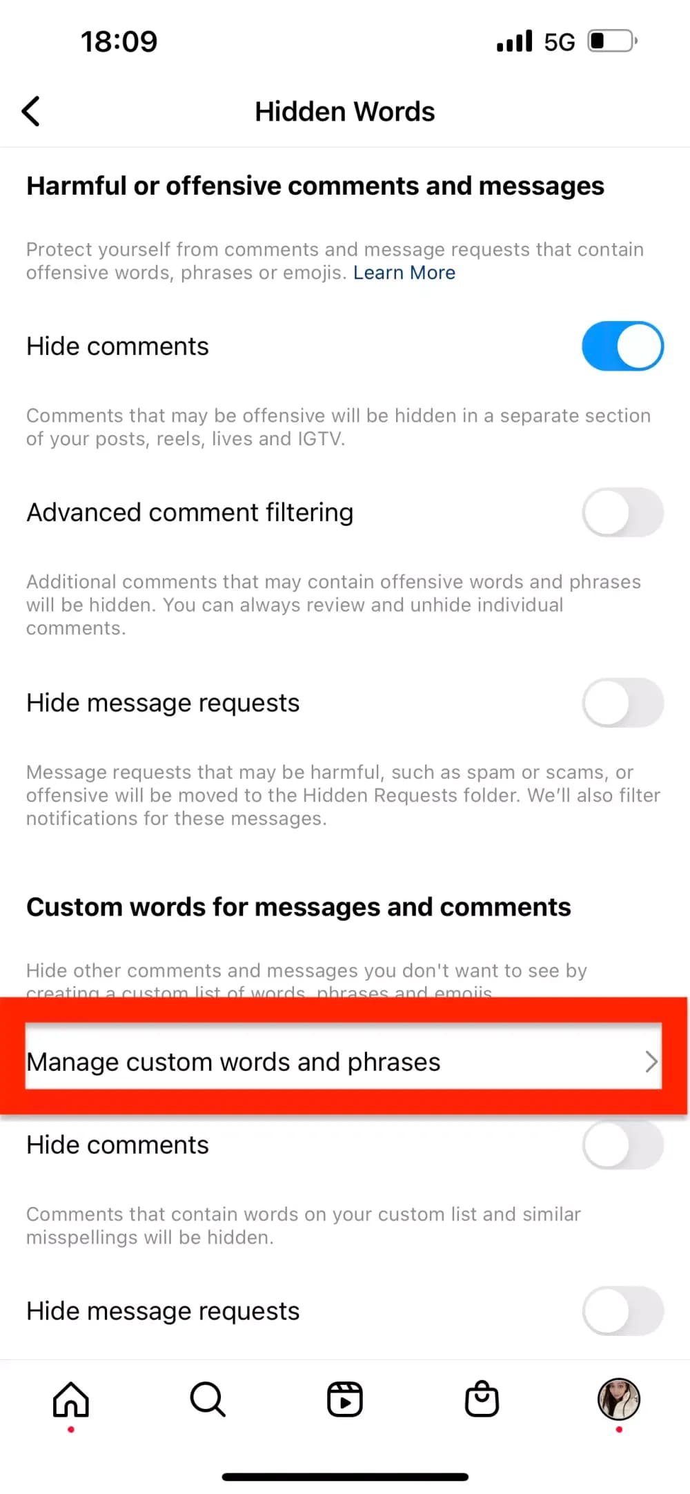 この問題に積極的になるには、最初からこれらのコメントを自分のページで許可しないことです。これは、InstagramのHidden Wordsを使用することで可能です。有効にする方法は次のとおりです。