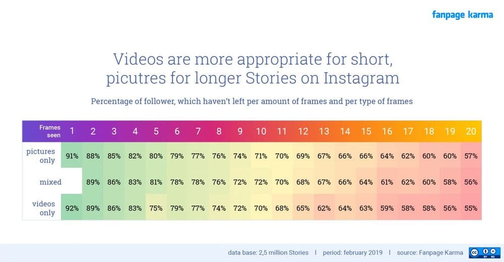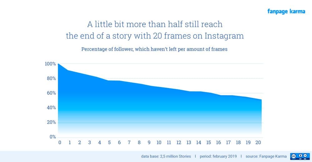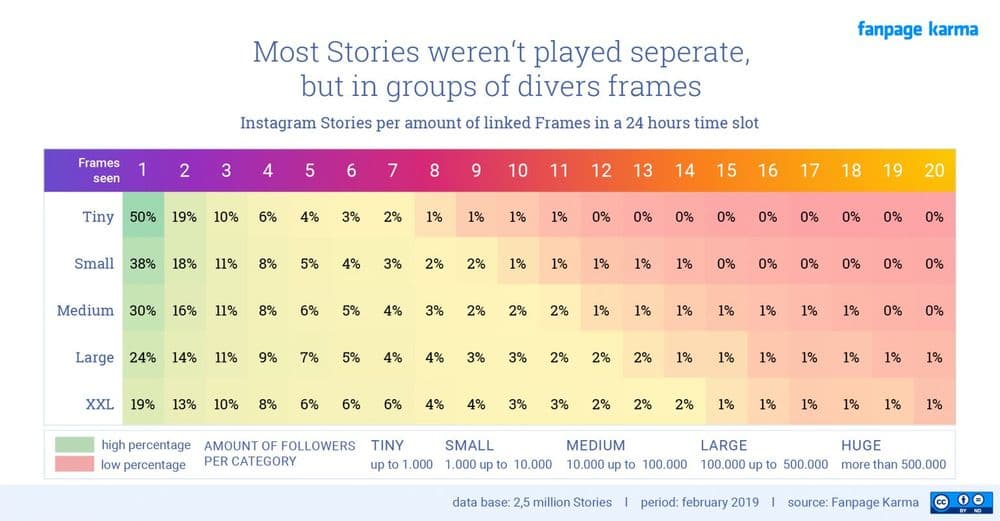 ユーザーがすべてのフレームを一度に見ることができるように連発することが重要です。そのためには、フレーム(各ストーリー)間にタイムラグを生まないようにするべきです。このような影響を排除するため、詳細な分析では、1つのフレームが10分以内に公開されたストーリーズのみを調査しました。この結果は意味のあるものであり、あらゆるタイプや長さのストーリーに簡単に適用することができます。