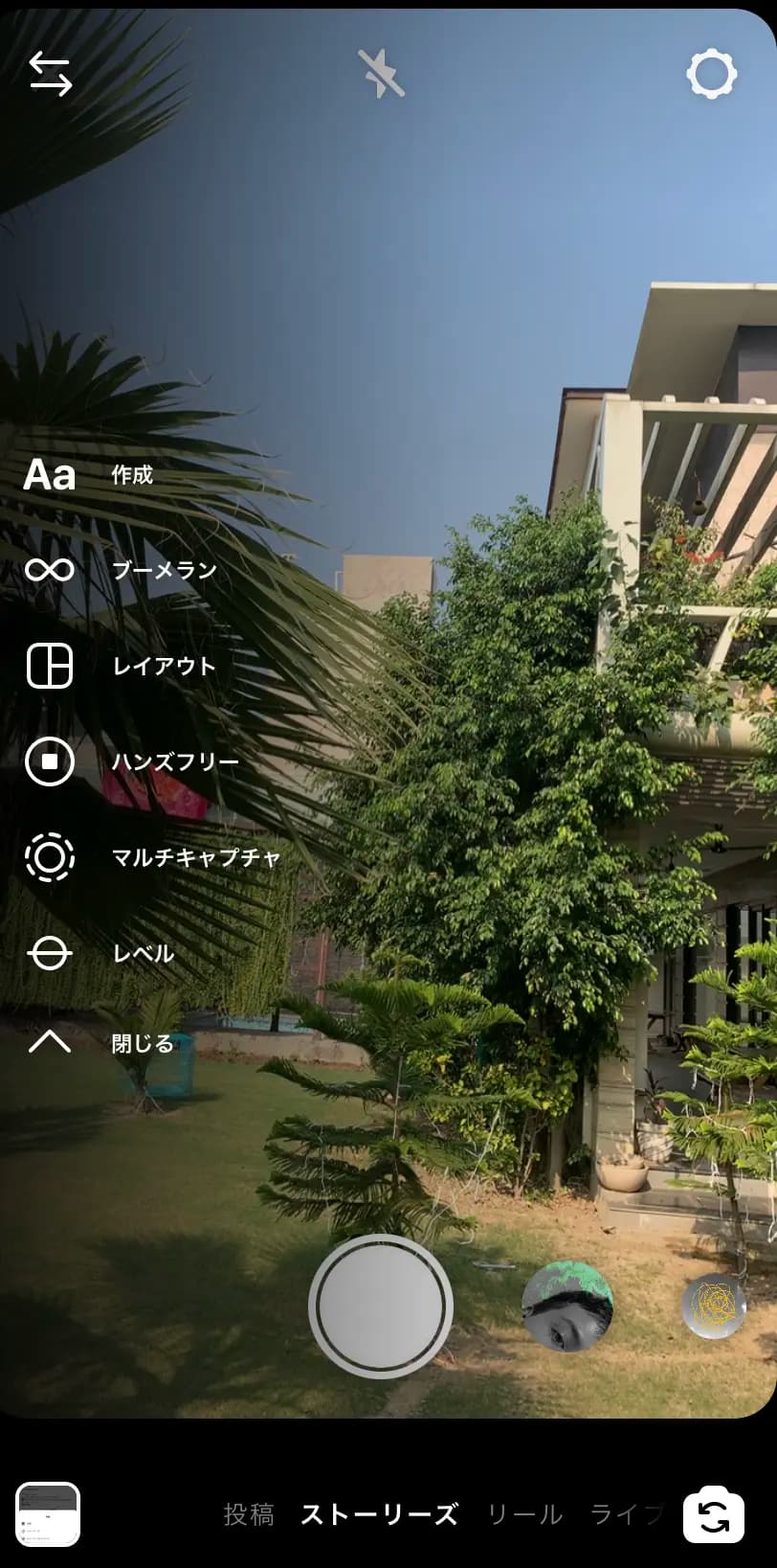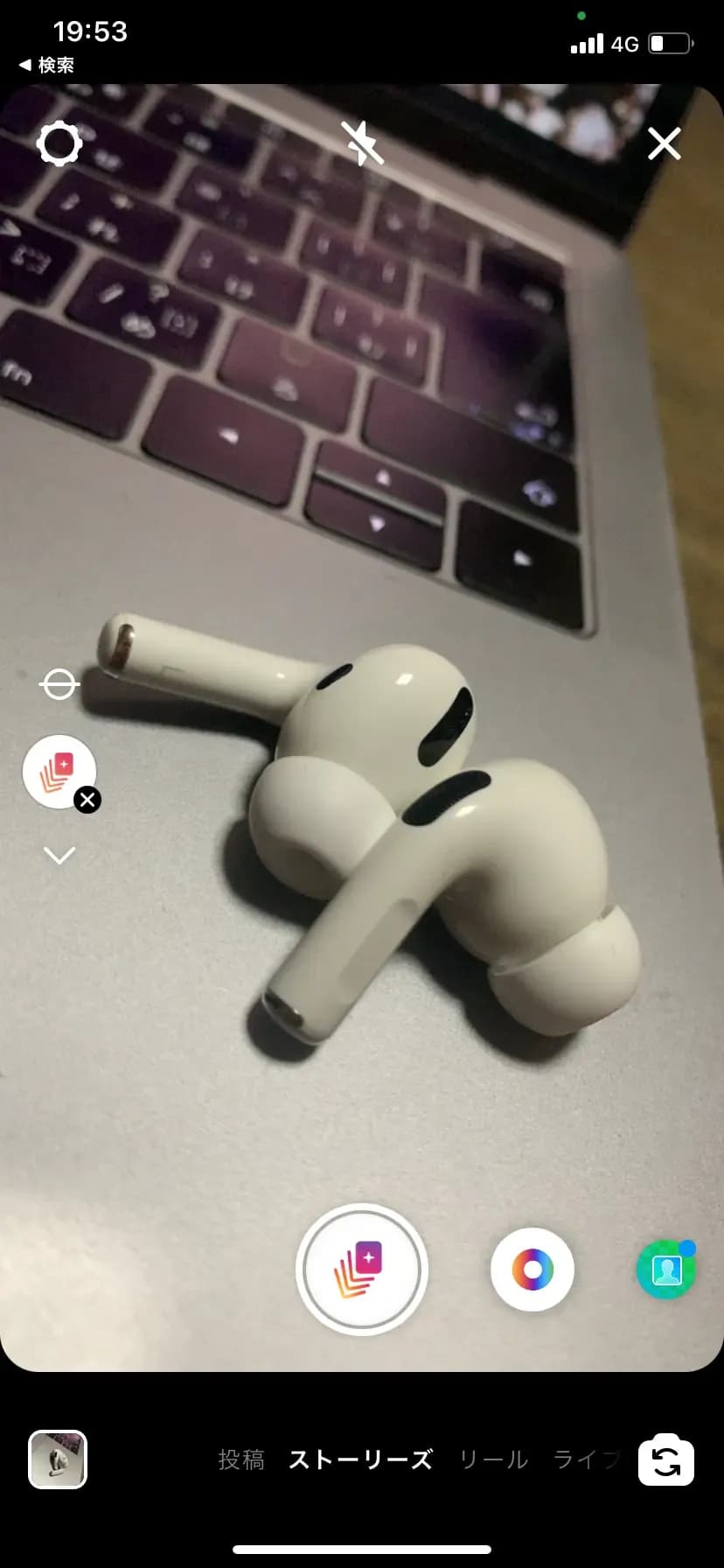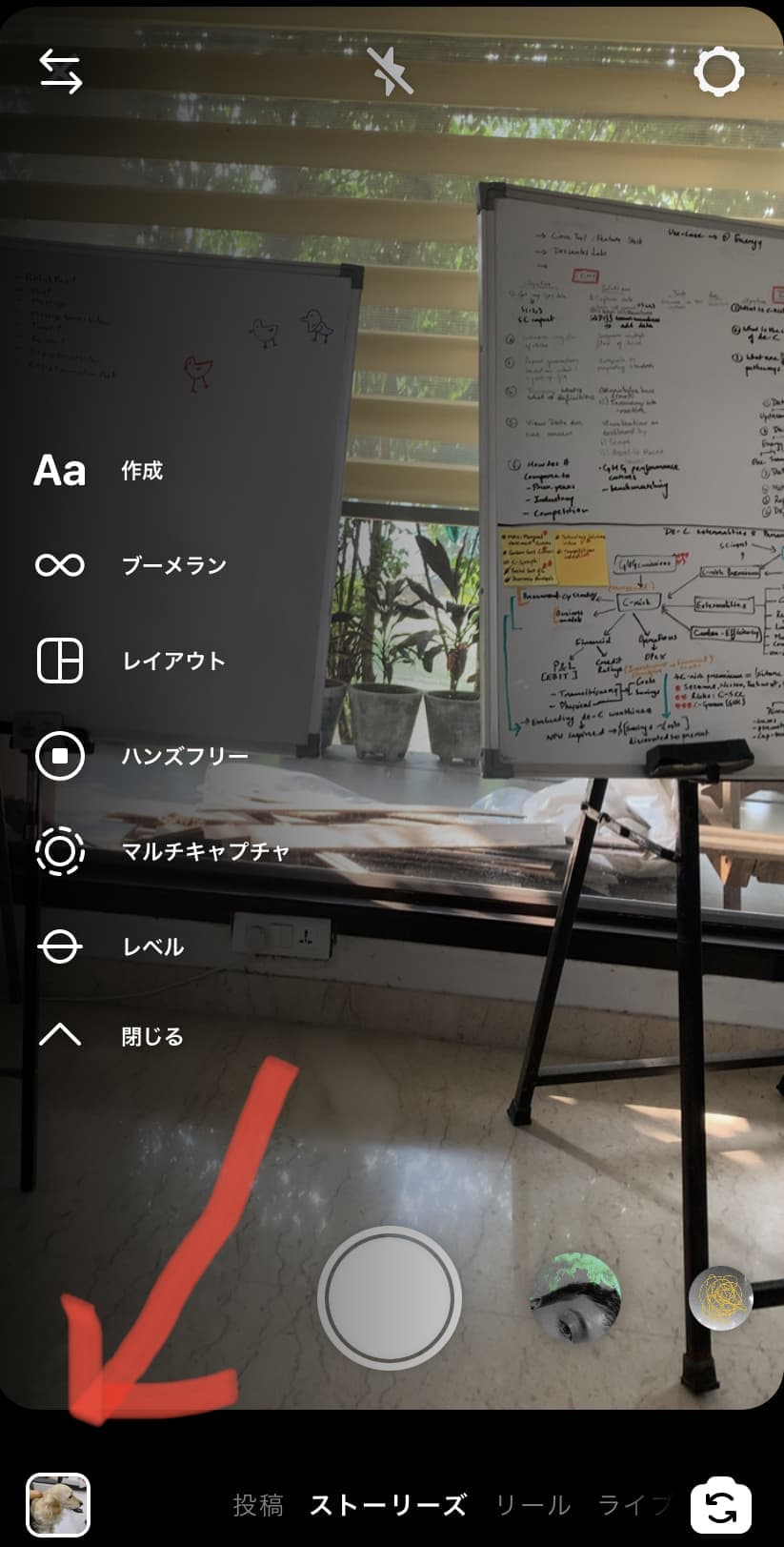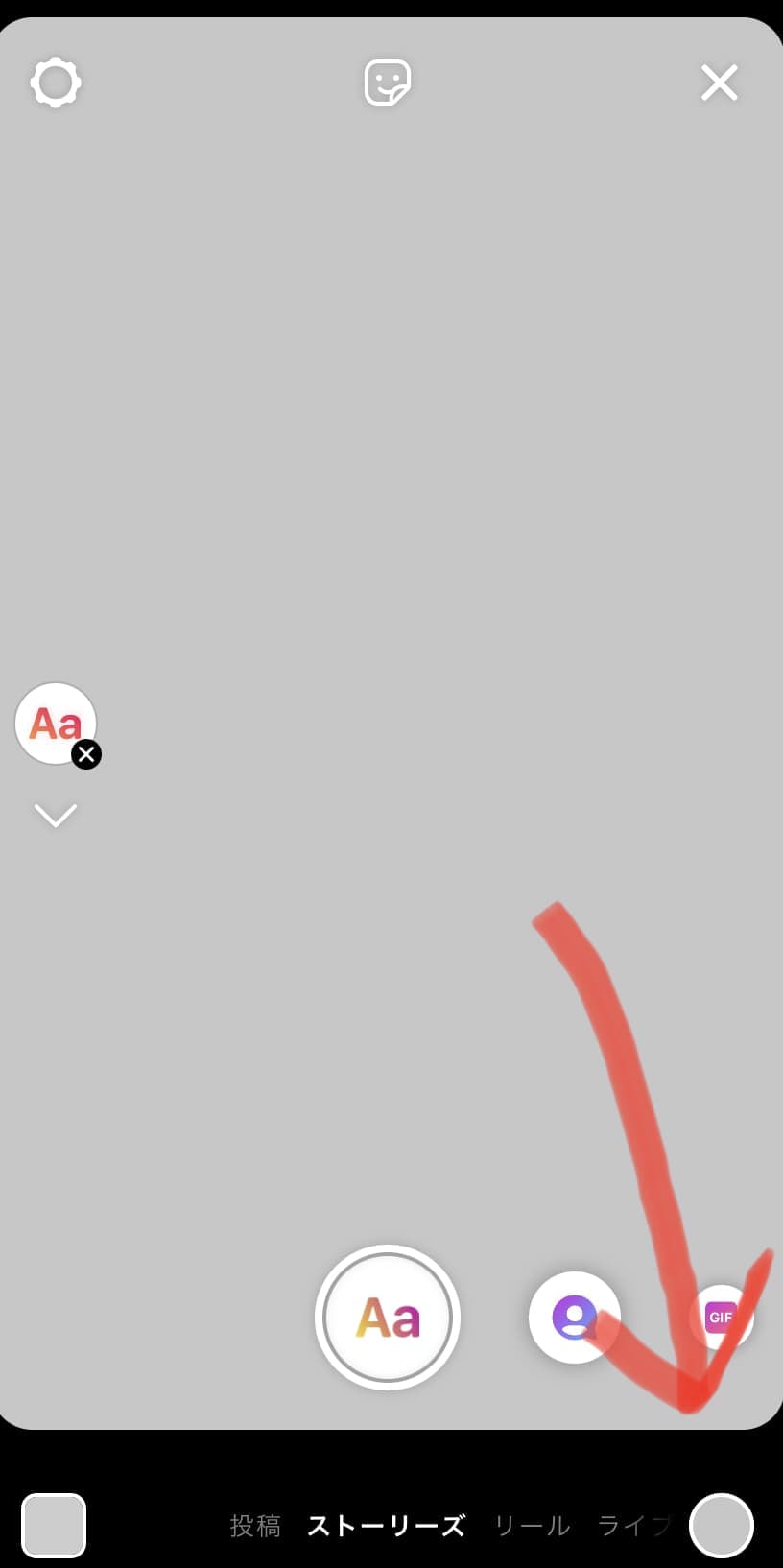 ストーリーズを開くとこちらの画面になり自動的にカメラも起動します。左側にアイコンメニューがあり6つの選択肢から選ぶことができます。(⬇️に続くマークをタップすると全ての選択肢が表示されます)