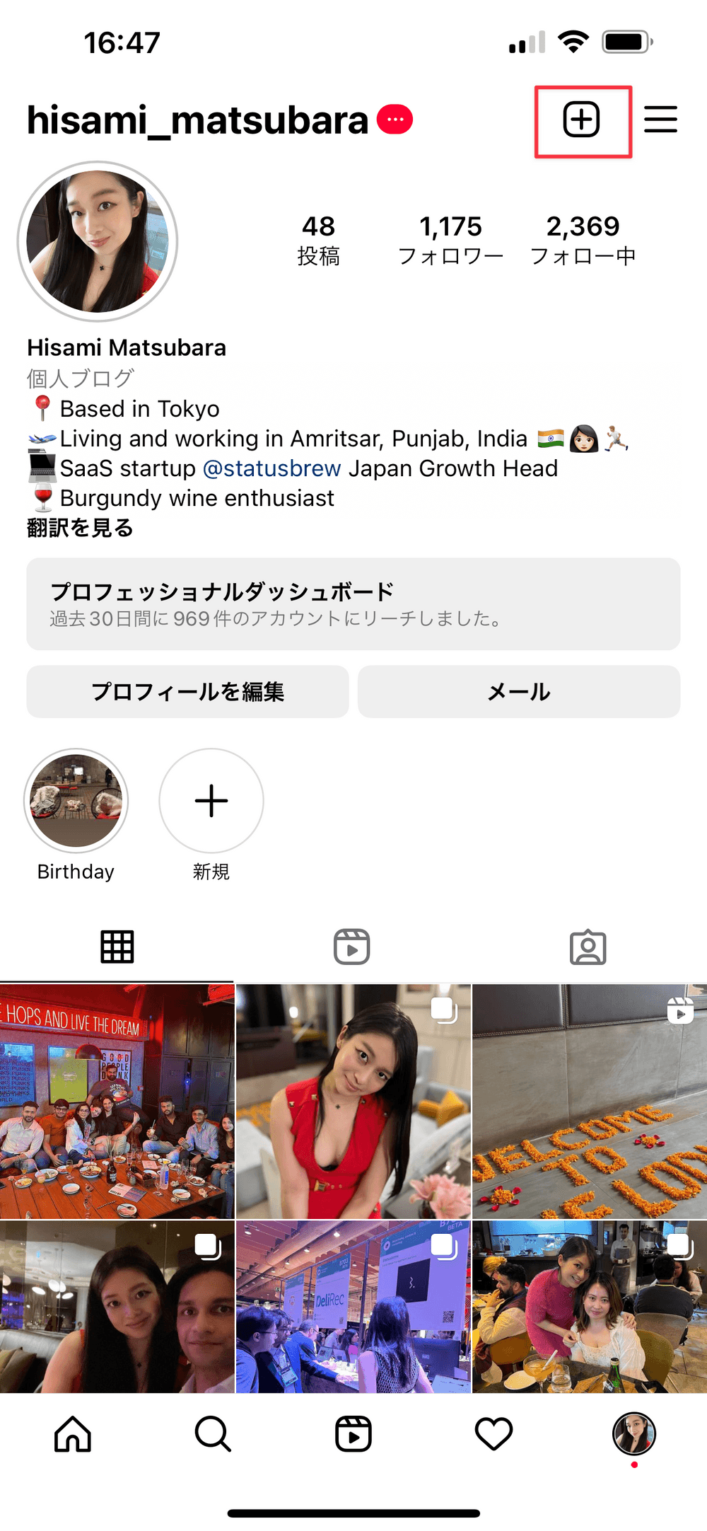 ご自身のアカウントのプロフィール画面の中央に丸い+マークがあるのでタップします。