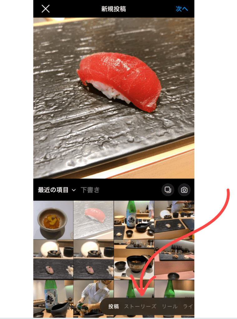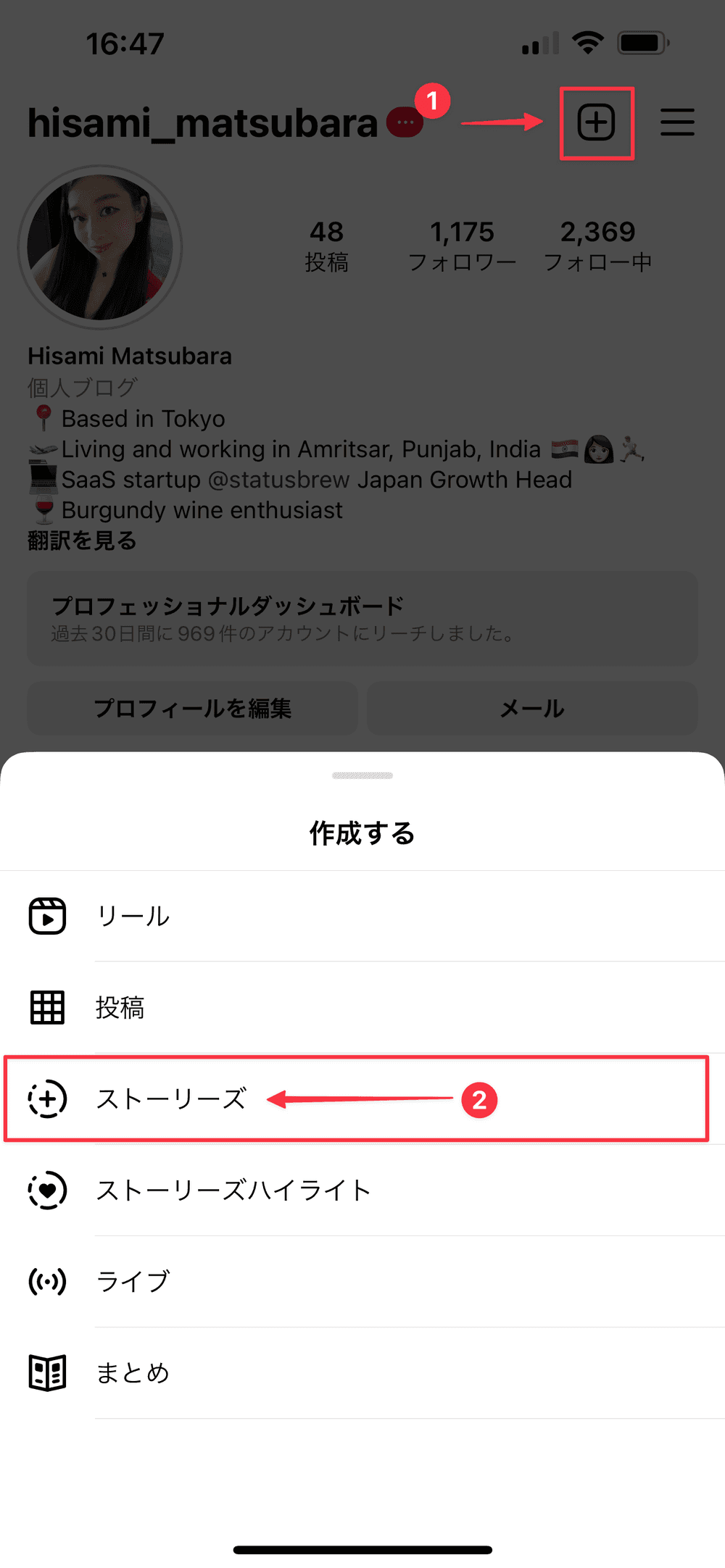 ・投稿(フィード) ・ストーリーズ ・ストーリーズハイライト ・IGTV動画 ・リール ・まとめ ・キャンペーン と投稿メニューがあるので上から2つめのストーリーズをタップします。
