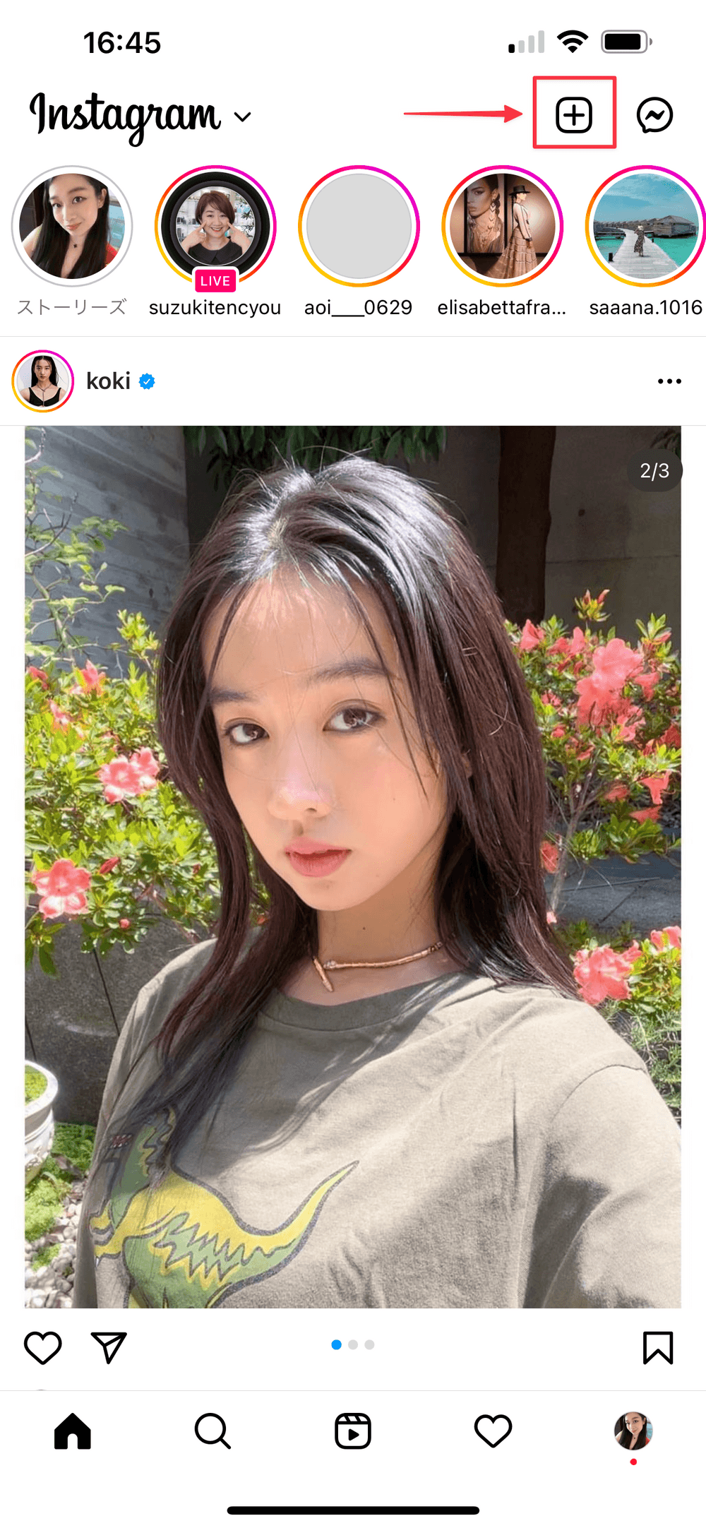 ご自身のプロフィール画面の右上にある +マーク をクリックします。同じように、