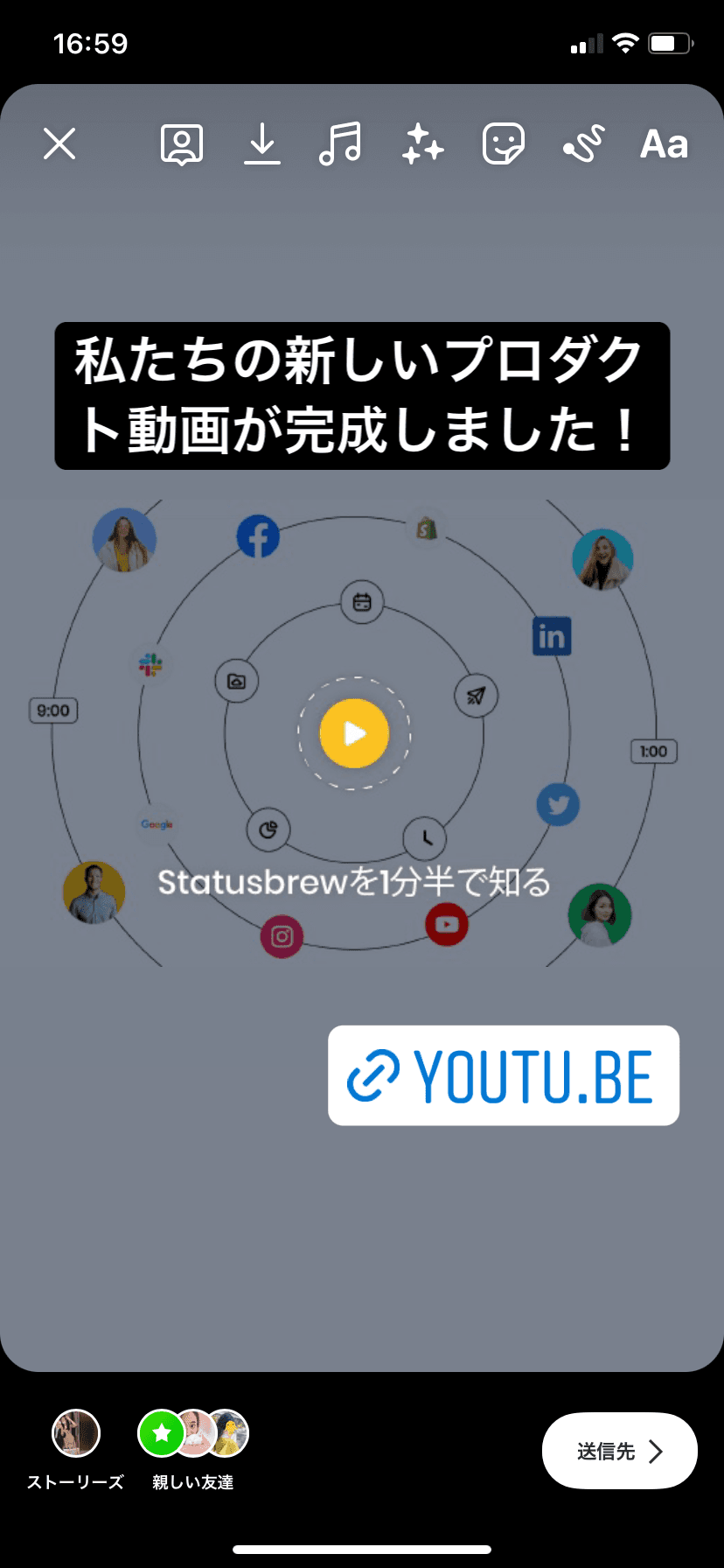 ついにストーリーズにおいてフォロワー数が1万人越さなくても、誰でもリンクが挿入できるようになりました!例えばYouTube動画のURLを挿入すると、自動的に表記がYouTubeに変わるので、動画に誘導しやすいです。