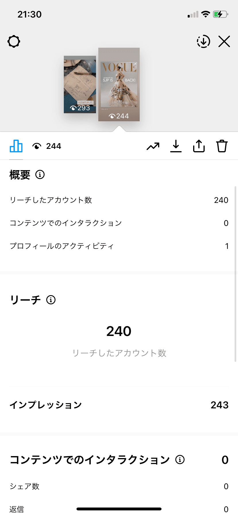 個々のストーリーズ投稿は、コンテンツライブラリ内に一覧表示され、各投稿のインプレッション、返信、クリック数などのデータを確認することができます。