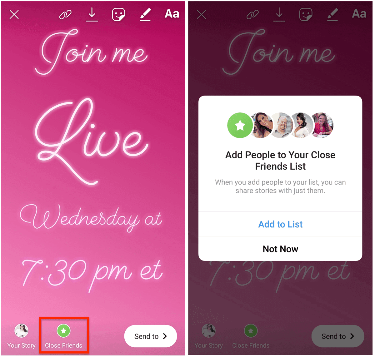 ・VIP顧客のリストを作成して新商品の紹介と特別割引を提供し、DMを通して顧客とやり取りする ・企業の舞台裏、新商品紹介、独占インタビューなど、特別な顧客のみを対象としたコンテンツを共有する ・物理的なイベントを盛り上げる:参加者のリストを作成し、イベントの開始時および開催中に限定的なそのイベントに参加している顧客のみにコンテンツを公開する ・特定の地域の顧客にローカルコンテンツを提供する ・インフルエンサーや共同編集者向けのリストを作成して今後の製品、キャンペーンなどシェア ・VIP顧客のリストを作成し、アンケートや質問ボックスなどのストーリーのインタラクティブ機能を使用して顧客のフィードバックを収集し、意見を次のキャンペーンに取り入れる