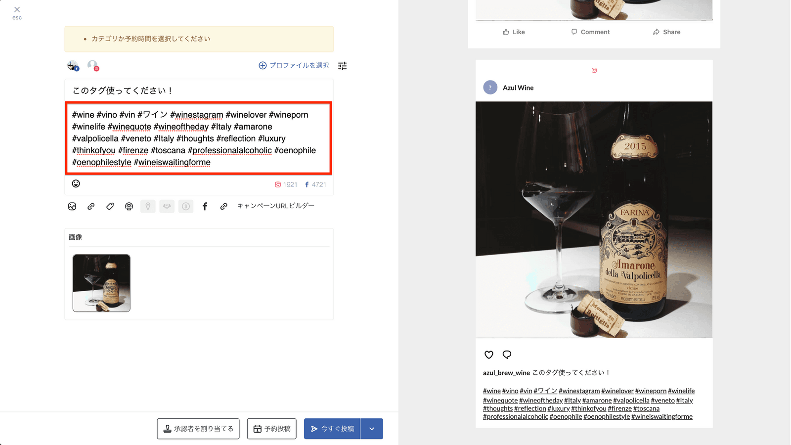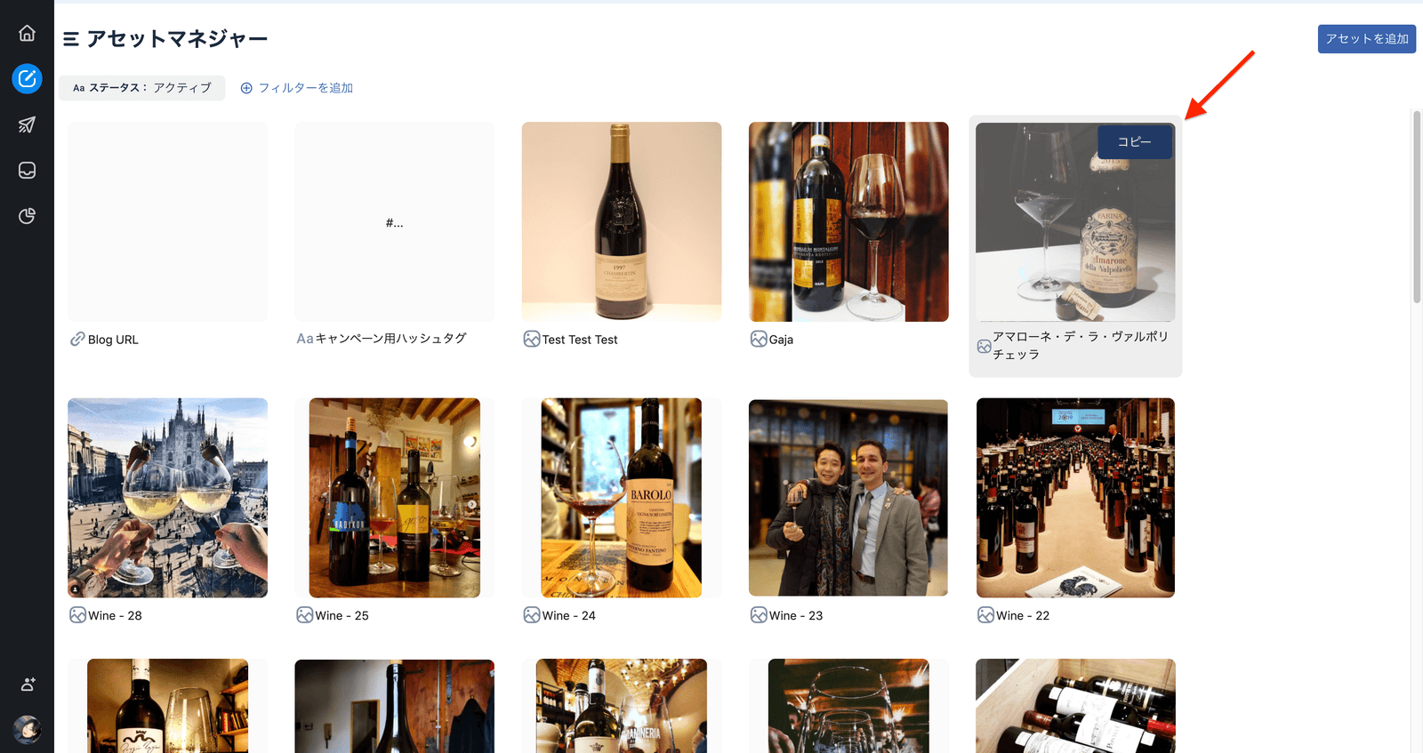 アセットマネジャー内で、頻繁に使用するコンテンツを、定番のハッシュタグとリンクを使用してテンプレートとして保存できますので、、画像の右上の<コピー>ボタンをクリックすると同時にStatusbrewのコンポーズが立ち上がります。 ハッシュタグやキャプションも引き継がれますので、お好みでコンポーズ内で調整してください。
