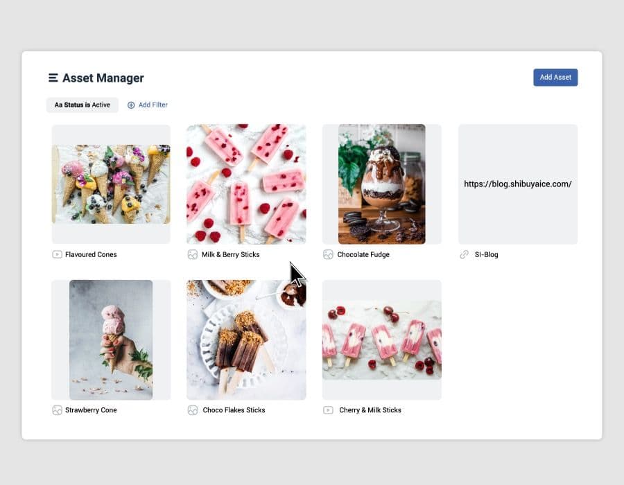 開くとこのようにコンテンツがライブラリ形式で広がっています。テキストとビデオの追加、およびStatusbrewのタグ付与機能の統合により、アセットライブラリを多面的なコンテンツライブラリとして使用できるようになりました。
