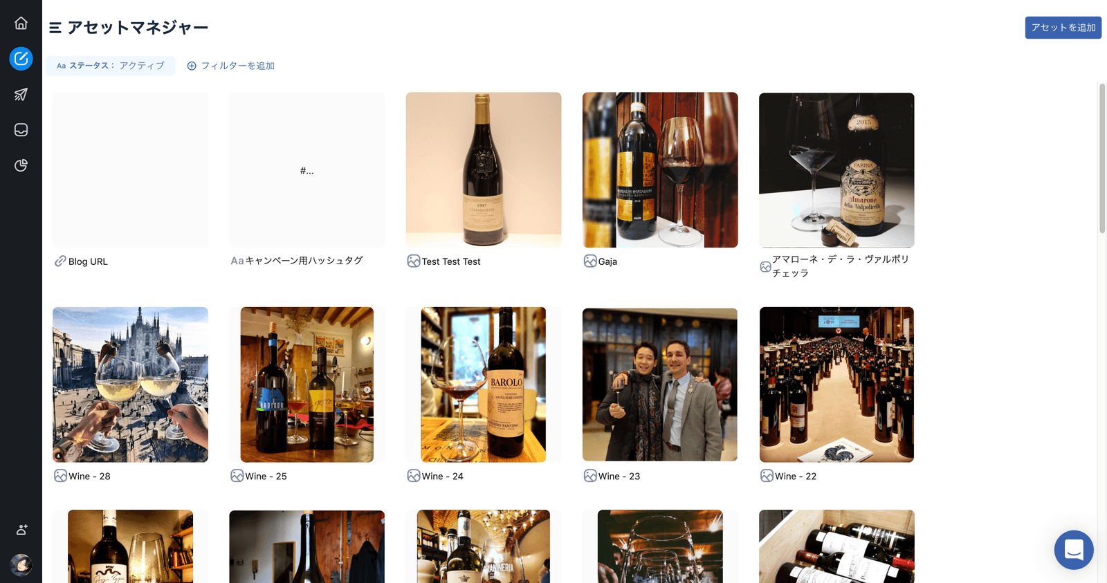まず、 ▶︎ステータスを変更できる もう使わないだろうというメディアは非アクティブ化できます。いつでも戻せます。 ▶︎コンテンツの様々なカテゴリで分けて整理ができる テキスト(ハッシュタグ含む)、画像・動画、カルーセルなどのコンテンツの種類ごと、タグごと、このアセットを作成した担当者ごとにフィルターをかけて検索できます。