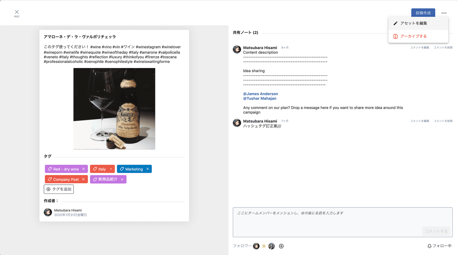ノートにあなたがこのコンテンツについてのキャプションを下書きとして書いておいて、上司やクライアントに@メンションして通知すれば、返事としてコメントをもらいましょう。 チャット形式なので時系列で変更点を常に追うことができます。