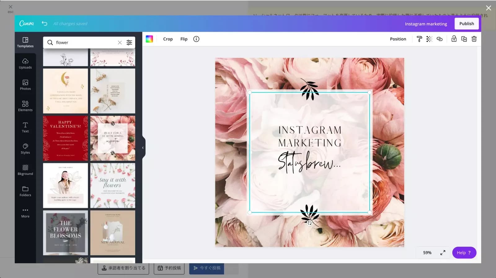 Statusbrewはオーストラリア発のデザインツールCanvaとインテグレーションしています。Canvaにはプロフェッショナルで美しい無数のテンプレートやエレメントがあります。よりクリエイティブにこだわる場合はぜひご利用ください。Statusbrewのコンポーズ(作成画面)からCanvaを立ち上げて投稿を作成後、そのまま自動予約投稿を行うことができます。