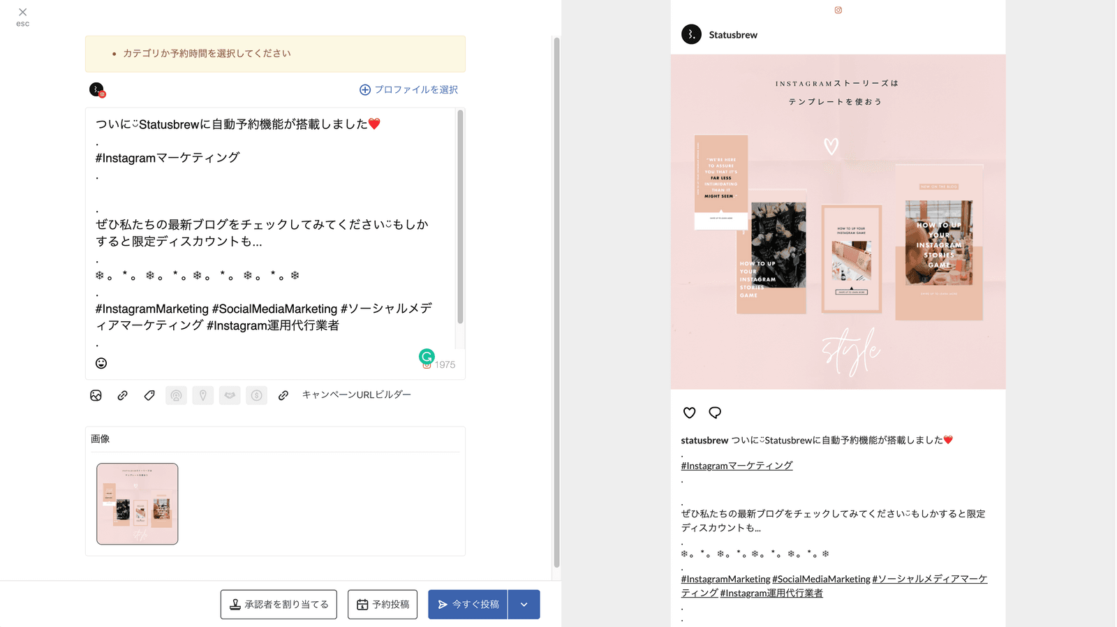 ストーリーズもStatusbrewのコンポーズにて作成・予約設定は可能ですが、これまで通り予約時間になるとモバイルに通知が来て送信していただく作業が必要でございます。