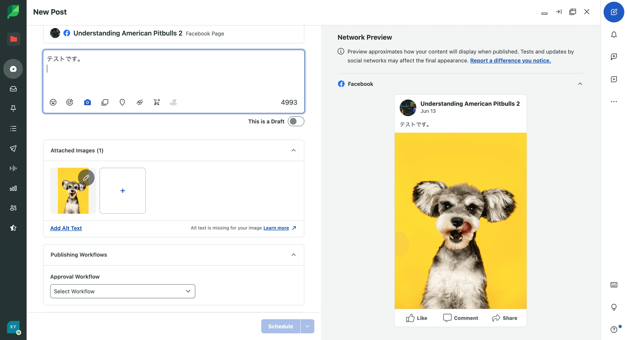 投稿を作成する際には、絵文字、対応するプラットフォームのターゲティング機能を使ったり、メディアをさまざまなチャネルからアップロードします。