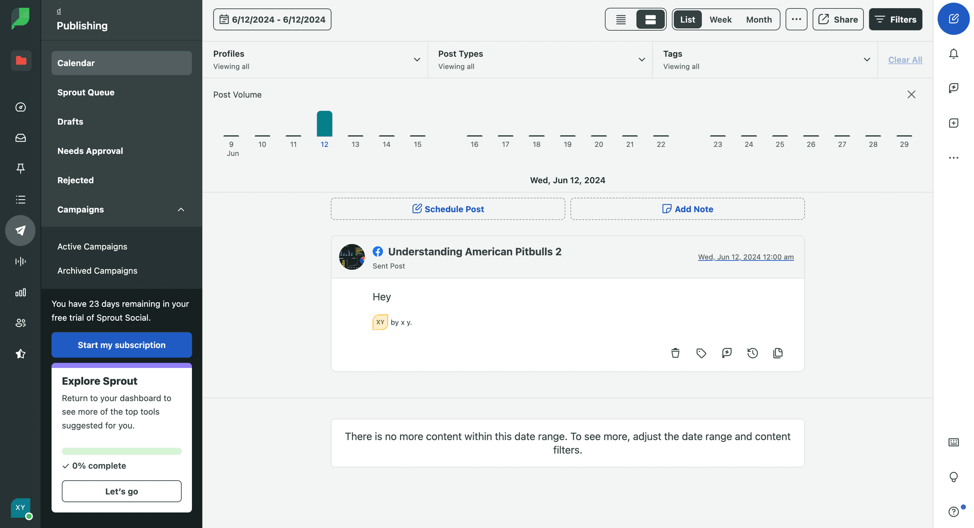 前後3週間に予約された投稿の数を示すボリュームチャートもSprout Socialの特徴です。