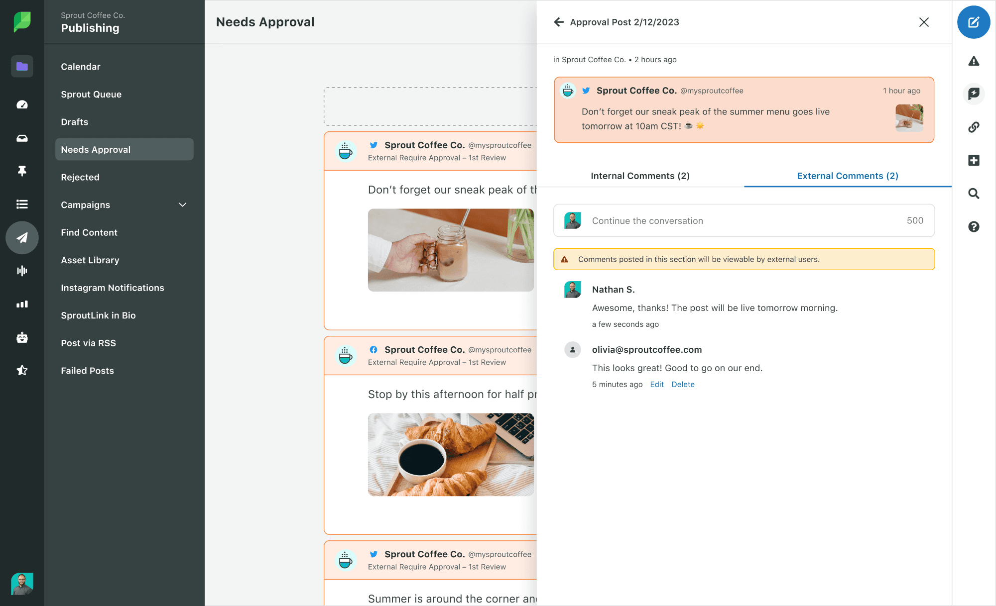 Sprout SocialのAdvancedプランを使用している企業は、承認ワークフローに個人のメールアドレスを追加するだけで、Sprout Socialに追加していない外部の承認者も追加できます。外部ユーザーがメールアドレスを確認すると、割り当てられた投稿をレビューし、フィードバックを提供し、承認を行うことができます。