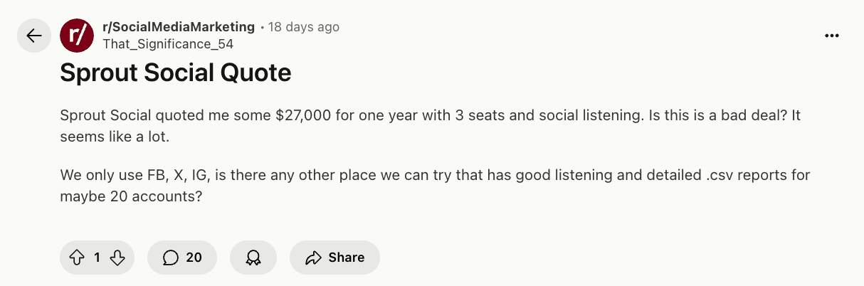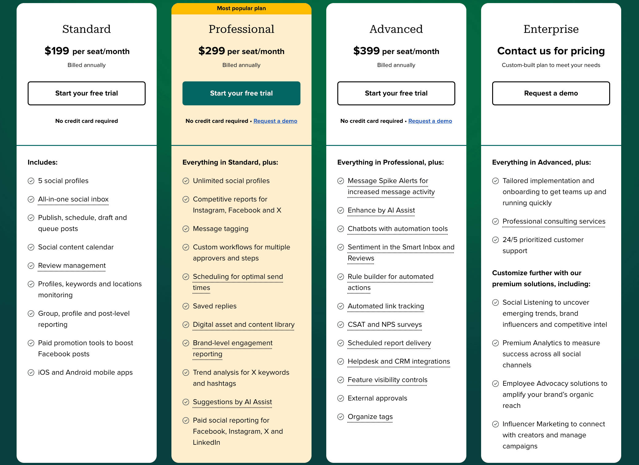 - Enterprise - – カスタム価格: Sprout Socialに直接連絡して見積もりを取得するプランです。追加機能には、24/5の優先サポート、コンサルティングサービス、ソーシャルリスニング、プレミアム分析が含まれます。