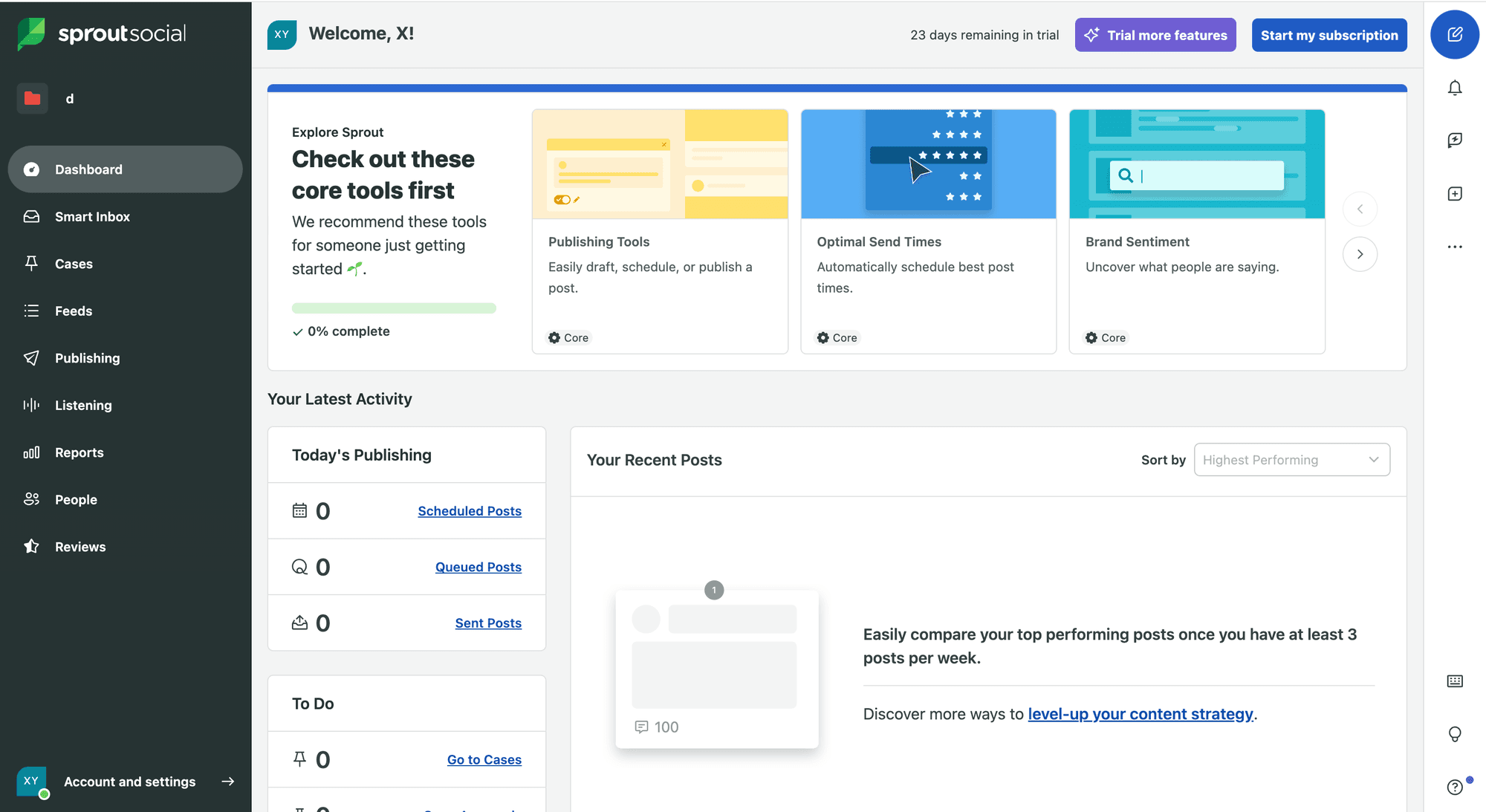 Sprout Socialのダッシュボード(ユーザーインターフェース)には、インターフェースの両側に2つのメニューがあります。左側のサイドバーはPublishing、Social Listening、Smart Inboxなど、Sprout Socialが提供するさまざまなツールへのクイックアクセスができるようになっています。