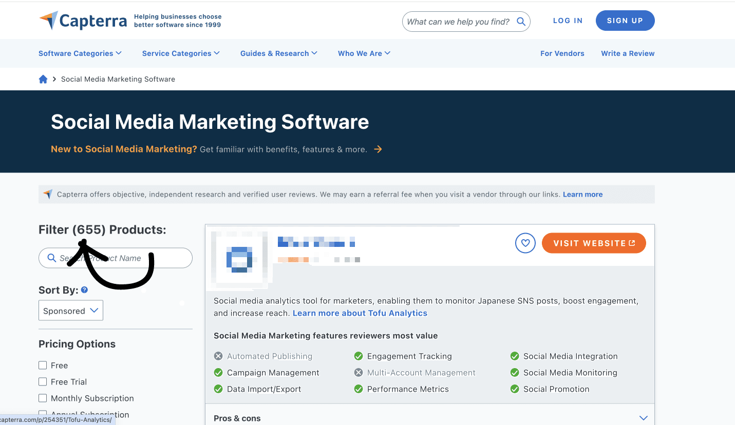 世の中には非常に多くのソーシャルメディアマーケティングツールが存在します。筆者も気になって、結局何個ほど世の中に存在しているのだろうか?と、おおよその母数を知るために、世界で最も有名で信頼性の高いソフトウェア評価プラットフォームCapterraで検索をかけてみると、655製品もありました。