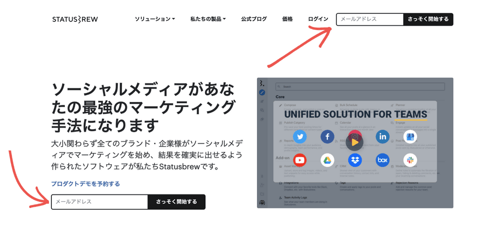 コンバージョン率の高いランディングページには、ページ全体に複数のCTA(Call-To-Action)を含める必要があります。 つまりサインアップやメールアドレスの登録などです。ページのどこに配置するか、どんなコピーにするかも重要な要素です。 Statusbrewのランディングページのヒーローセクションには、すぐにでも始めたい人のためのCTAがあります。 また、もう少し説得力が必要な訪問者のために、ページの下部近くにもあります。そしてサブランディングページにもあらゆる必要と思われるところに配置しています。