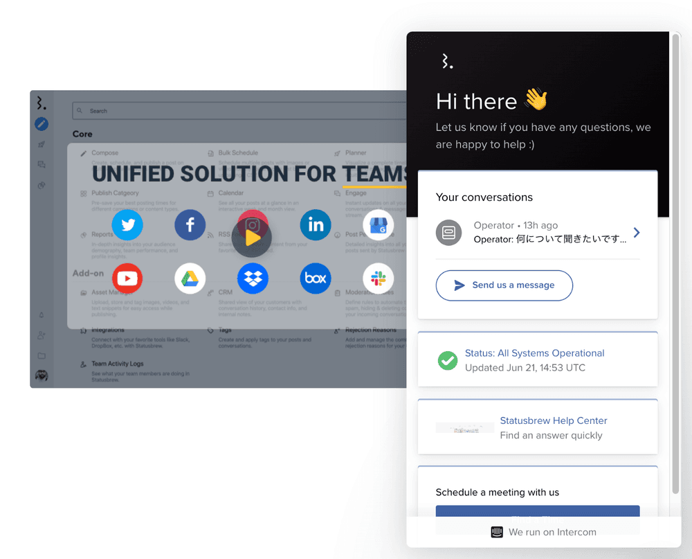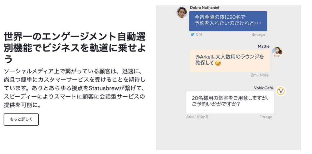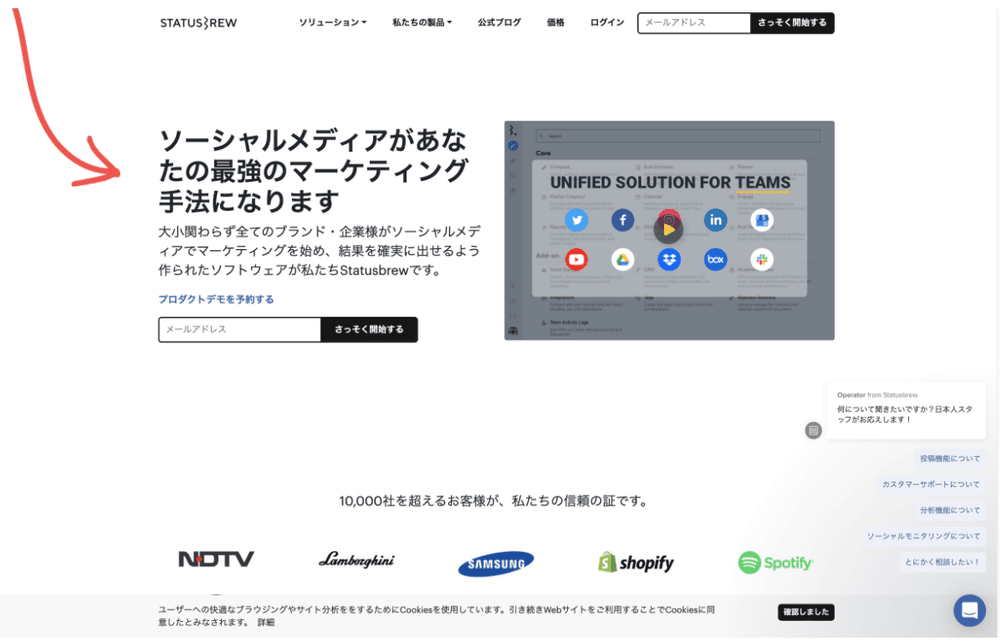 Statusbrewではランディングページでユーザーがすぐに私たちに問い合わせができるライブチャット窓口を設けています。
