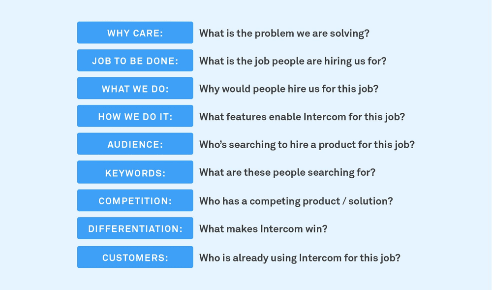 一部抜粋すると…彼らはどんな問題を抱えていますか? ユーザーが私たちを採用するジョブとは?あなたの製品は解決できますか? どのようにしてソリューションを検索しますか? ユーザーは解決策を見つけるためにどのような言葉やフレーズを使用していますか?あなたの製品が競争に勝つ要素は何ですか?