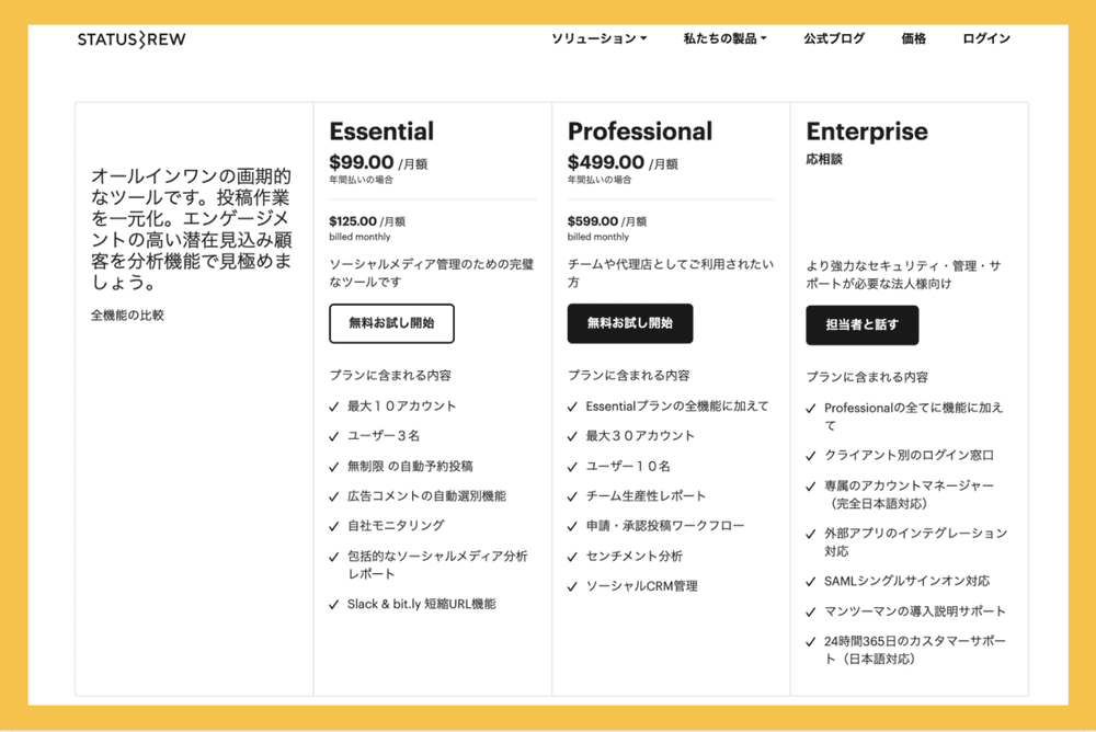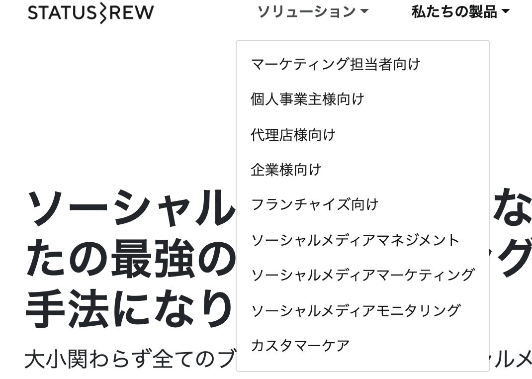 Statusbrewでは私たちの主要な4つの機能ごとのサブランディングページも作成していますが、よりユーザーのフェーズに合わせて、そのジョブを強力にする主要なサブジョブについて説明しています。具体的には上記のように、ユーザーの仕事での立ち位置に合わせたセクションと、ジョブの目的に合わせたソリューションをメニューとして提示しています。そうすることで自分のファンネルはどこかをユーザーが自分自身で無意識のうちに見つけることができるのです。