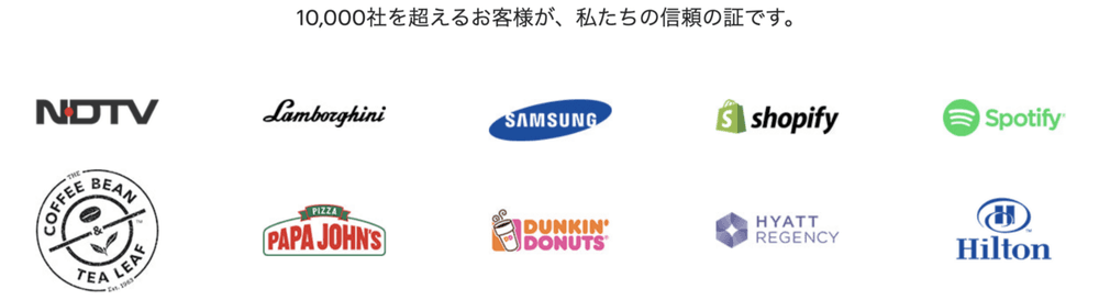 見込み客との信頼性をコンバージョン前から確立することは非常に重要です。 具体的には、実際の顧客の自社ロゴは、社会的エビデンス、信頼性を提供する効果的な方法です。「このような企業様にもご利用いただいています」と言うメッセージは何よりも製品を採用する時に、製品を使用している実際の企業があることを保証されている安心感を与えます。