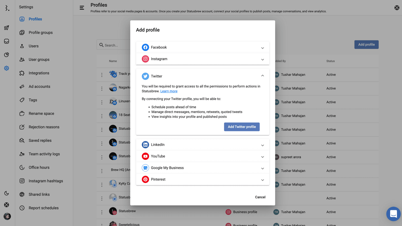 (1) Statusbrewアカウントにログイン後、設定ページからプロファイル追加に進みます。