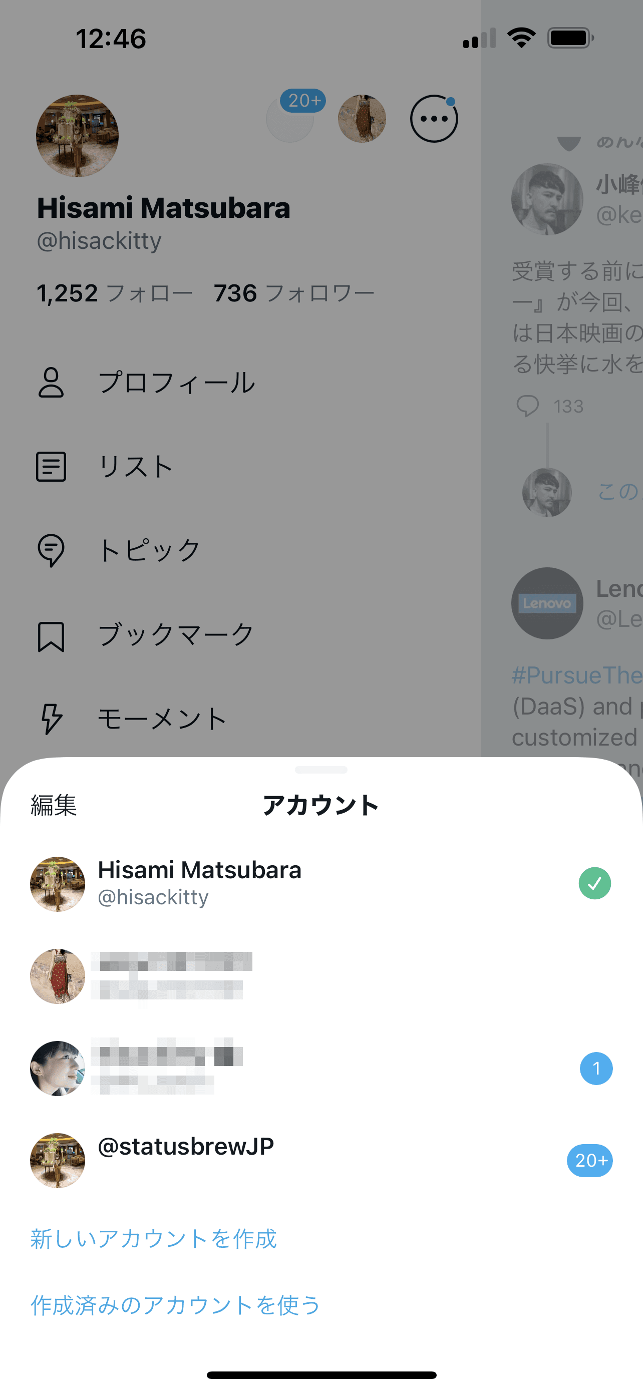 次に、画面左上のプロフィール画像をタップし、パネルの右隅にある3点ドットメニューをタップして、"作成済みのアカウントを使う"に進みます。 ログインしたい2つ目のアカウントの認証情報を入れて、完了です。 アカウントの切り替えは、メインパネルに表示されているプロフィール画像をタップして切り替えます。