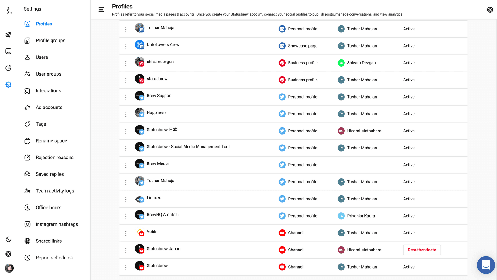 (4) Twitterの複数アカウントはこのように他のソーシャルプロファイルとともに一列に並びます。ここから細かなアクセス権限など設定ができます。