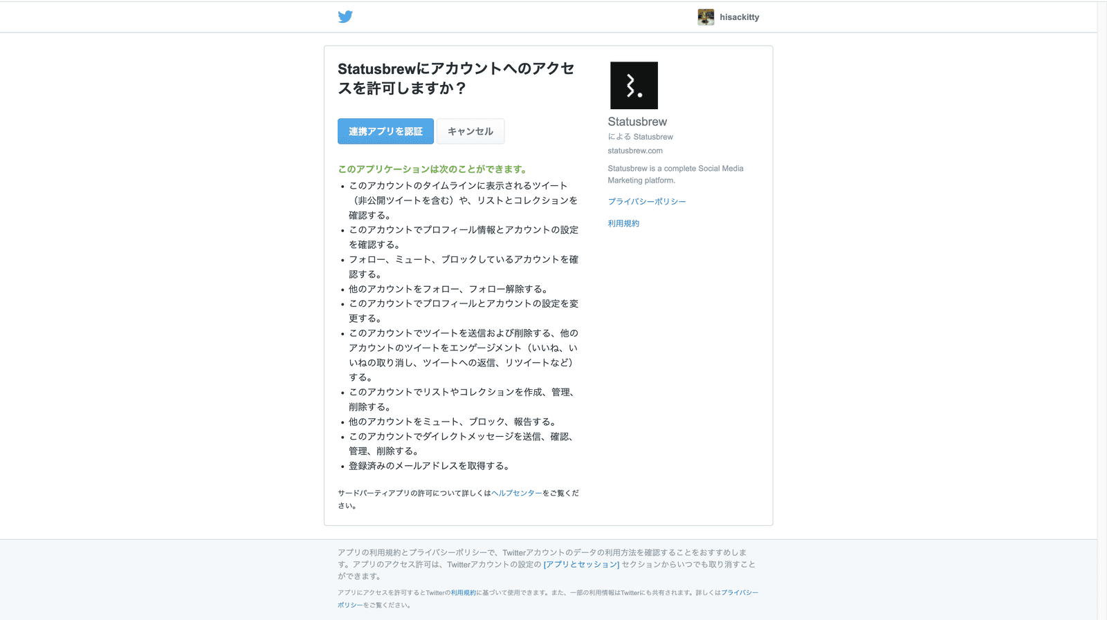 (3) TwitterネイティブがStatusbrewとの連携認証を確認しますので、指示の通り進みます。