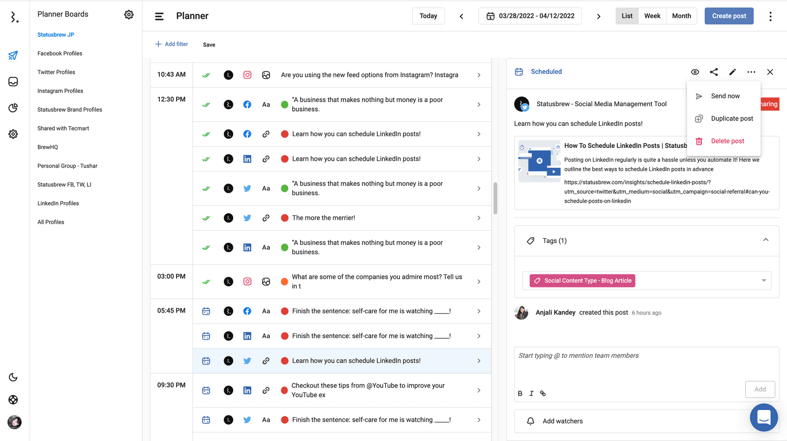 StatusbrewのプランナーはTwitterをはじめとしたソーシャルメディアの予約一覧管理表です。複数のTwitterアカウントもアカウントごと、タグごと、投稿担当者ごと、などに分けて管理することができます。