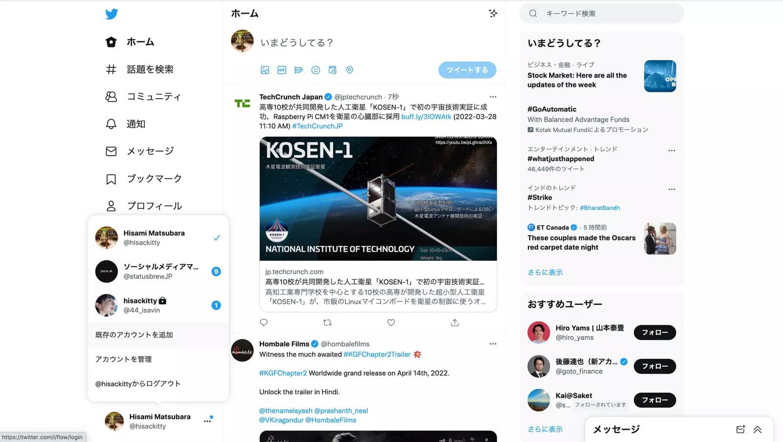 モバイルアプリと同じように、左手のサイドパネルで自分のプロフィールセクションにある3点ドットメニューをクリックします。 ここから、既存のアカウントを追加するか、新しいアカウントを追加するかを選択します。 あとは、それぞれのプロフィールアイコンをクリックしてアカウントを切り替えれば、ツイートが開始できます。