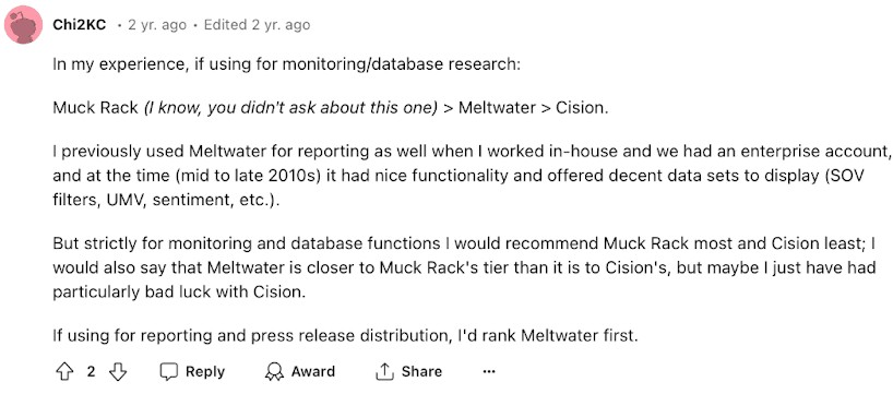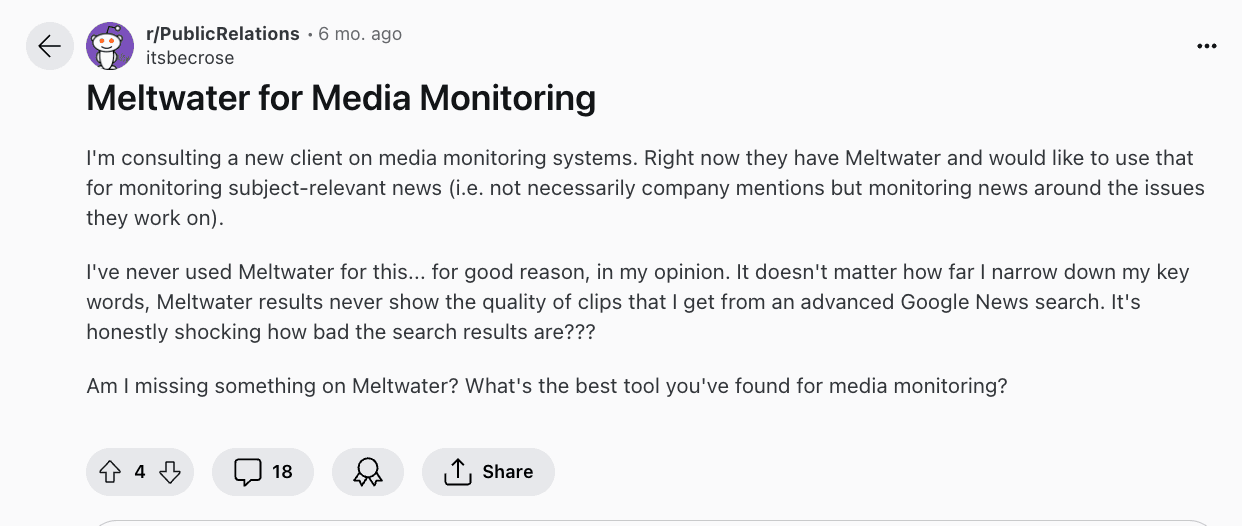 世界最大の掲示板型ソーシャルであるRedditでMeltwaterについての会話スレッドを300件以上見てみると、世界のユーザーはどちらかというとMeltwaterをソーシャル管理ツールとしては見ておらず、「ニュースメディアモニタリング」という位置付けで見ている世論が受け取れました。