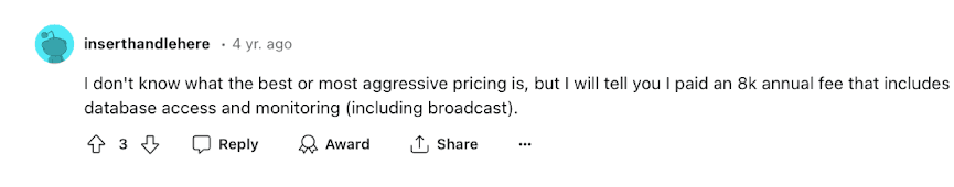 ridditこのユーザーが述べているように、レポーティング機能だけで年間約1万ドルの費用がかかります。