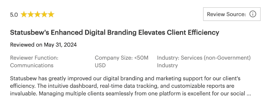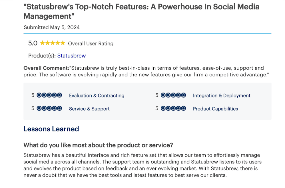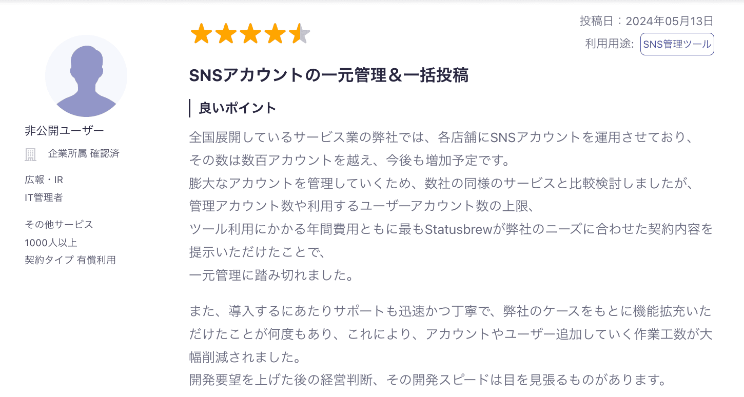 Gartnerレビュー Gartnerのレビューによると、Statusbrewの価格設定は合理的であり、その機能は多岐にわたることから、企業のソーシャルメディア戦略において強力なツールであると評価されています。特に、エンタープライズ向けの機能が充実している点が高評価を受けています。
