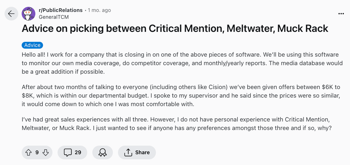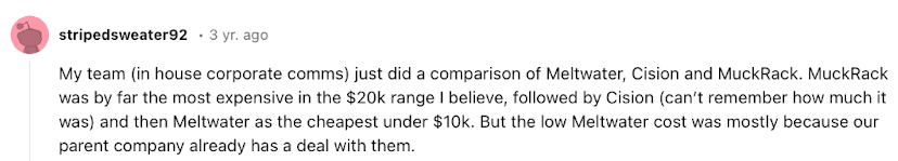 Meltwaterの価格に関する正確な情報を得るために、実際のMeltwaterユーザーのコストに関する口コミを調べました。そして、多くの中小企業がMeltwaterを導入しようと考える際に、コスト面での懸念があることがわかりました。以下は実際のユーザーの声です。