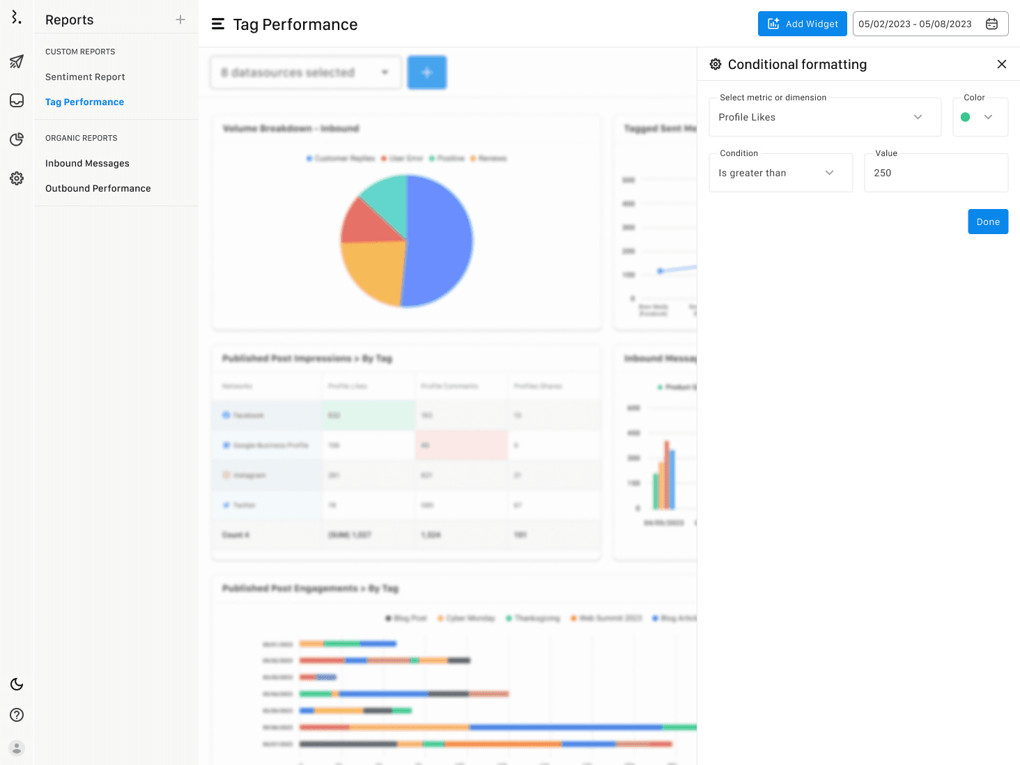 時間帯ごと、曜日ごと、特定のカテゴリーに定義された投稿ごと、内容ごと、センチメントごと、とさまざまな角度から提供します。