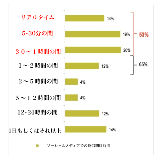 特に、TwitterなどのSNSでは、1時間以内に返信が欲しいユーザーが全体の53%です。(Hubspot調べ)タイムリーに対応して欲しいのは、ソーシャルでもオフラインでも同じですね。