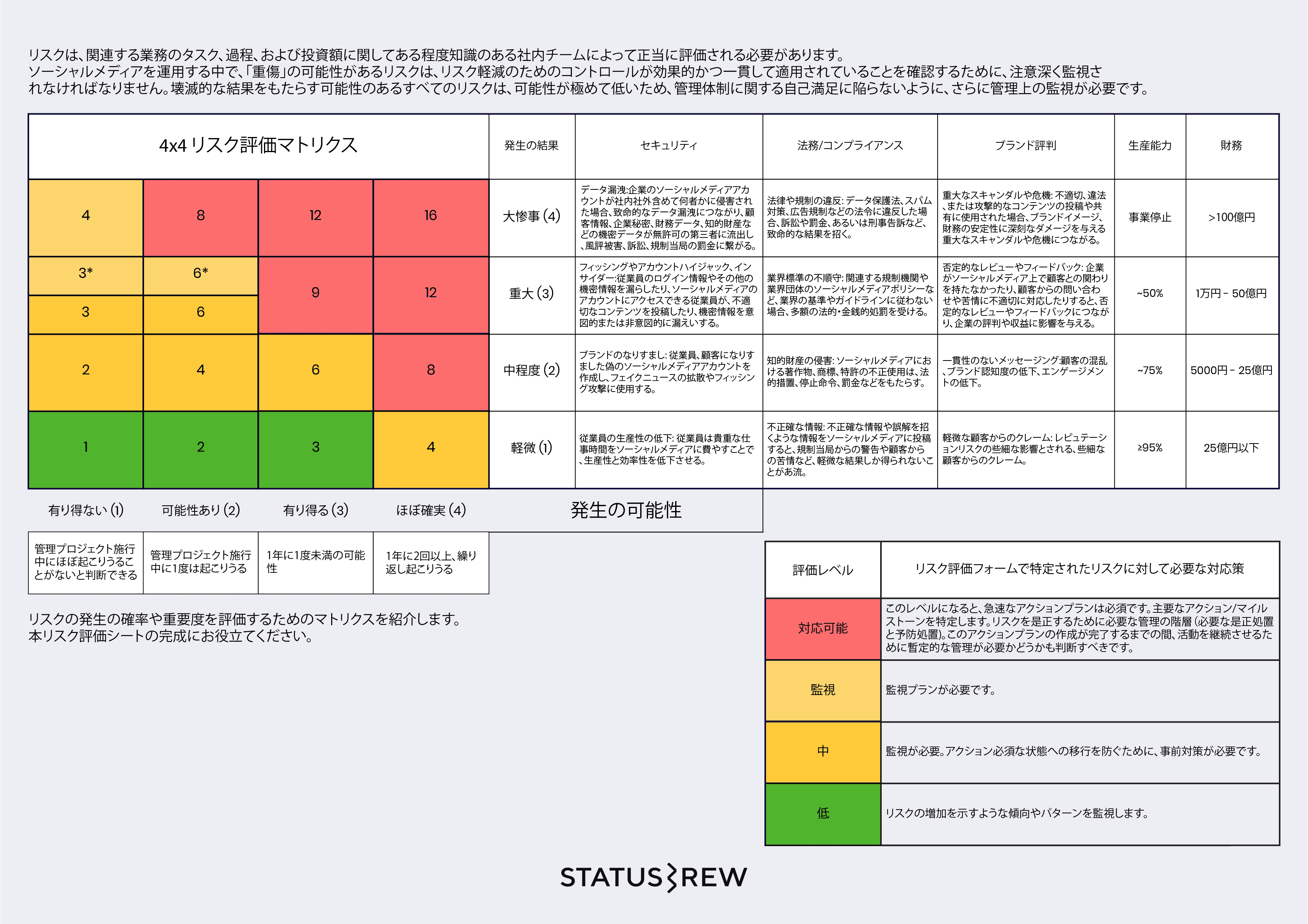 (2)リスク評価: クライアントの業界や事業内容に応じたリスク要因を特定し、それに対処するための対策を検討します。リスク評価=リスク・アセスメントという考え方はご存知でしょうか?コメント監視を行うには、そもそもリスクを洗い出して、リスクの評価=スコアリング、そのスコア(危険度深刻度)の高い順から対応するというフレームワークを知っていなければなりません。