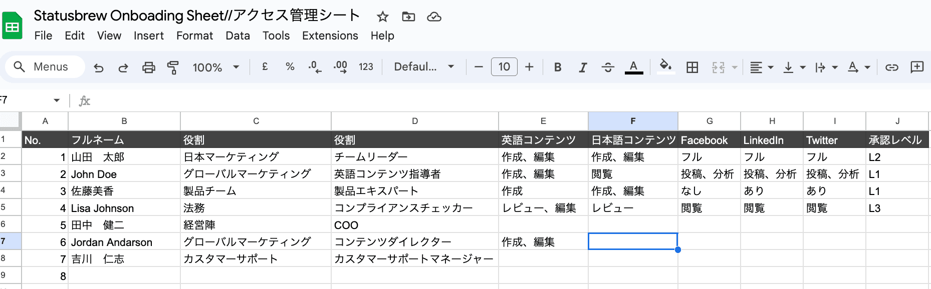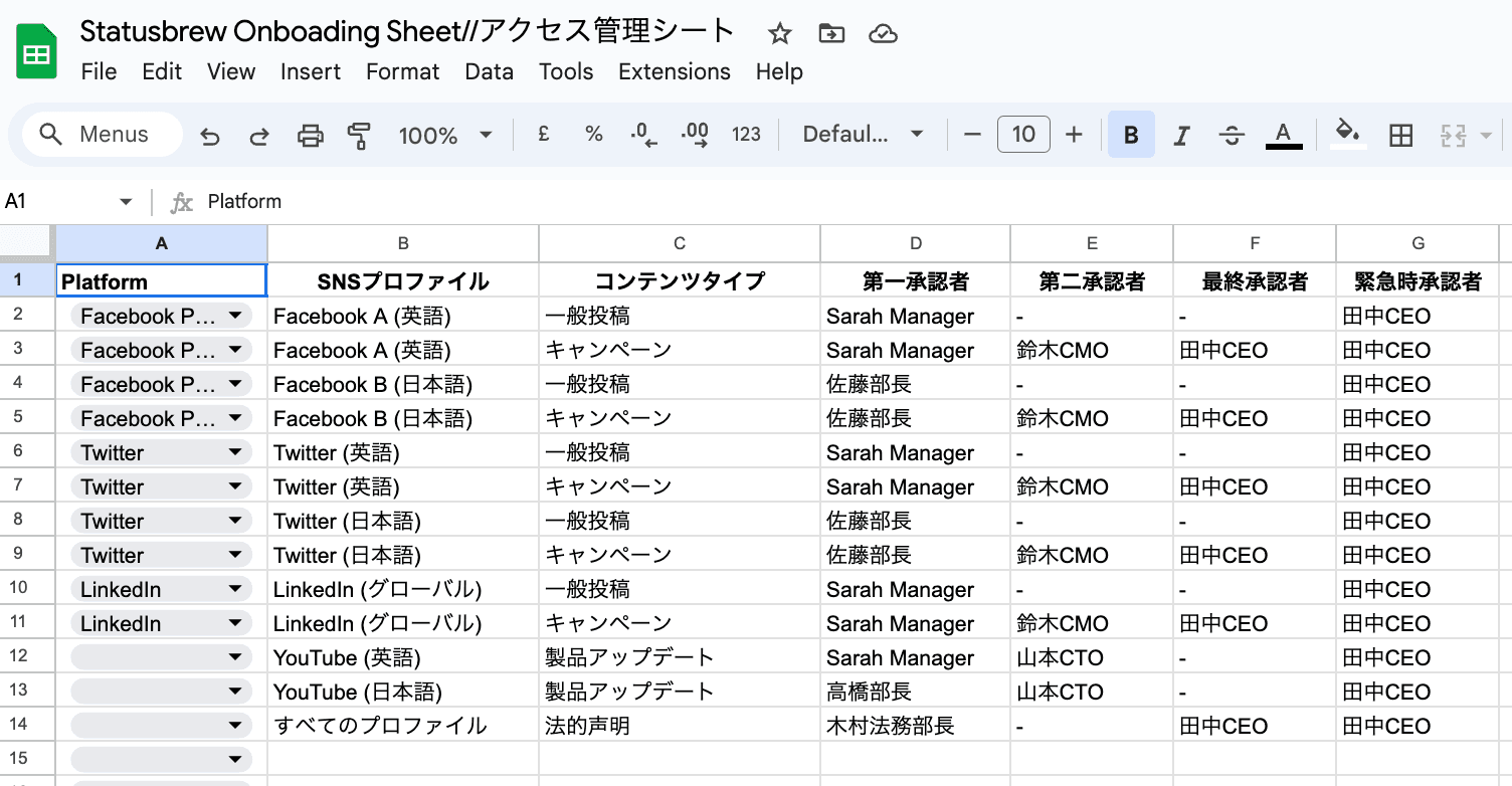 実際に、自社のメンバーと部署をルーツに、バイリンガルSNSコンテンツの投稿管理をスタートすること、また、SNSアカウントの所有状況やアクセス状況をガバナンスとともに管理していくために、シートを作成してみましょう。