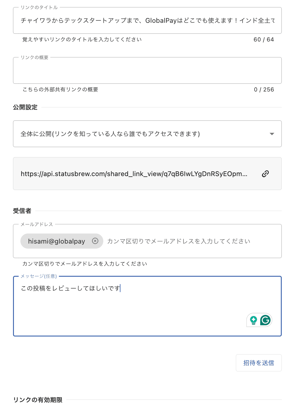 もし、わざわざユーザーの追加するまでもないメンバーに対して、簡単なフィードバックを求めたい場合は、「共有リンク」を作成し、相手をメールで招待すると、投稿リンクが生成されます。